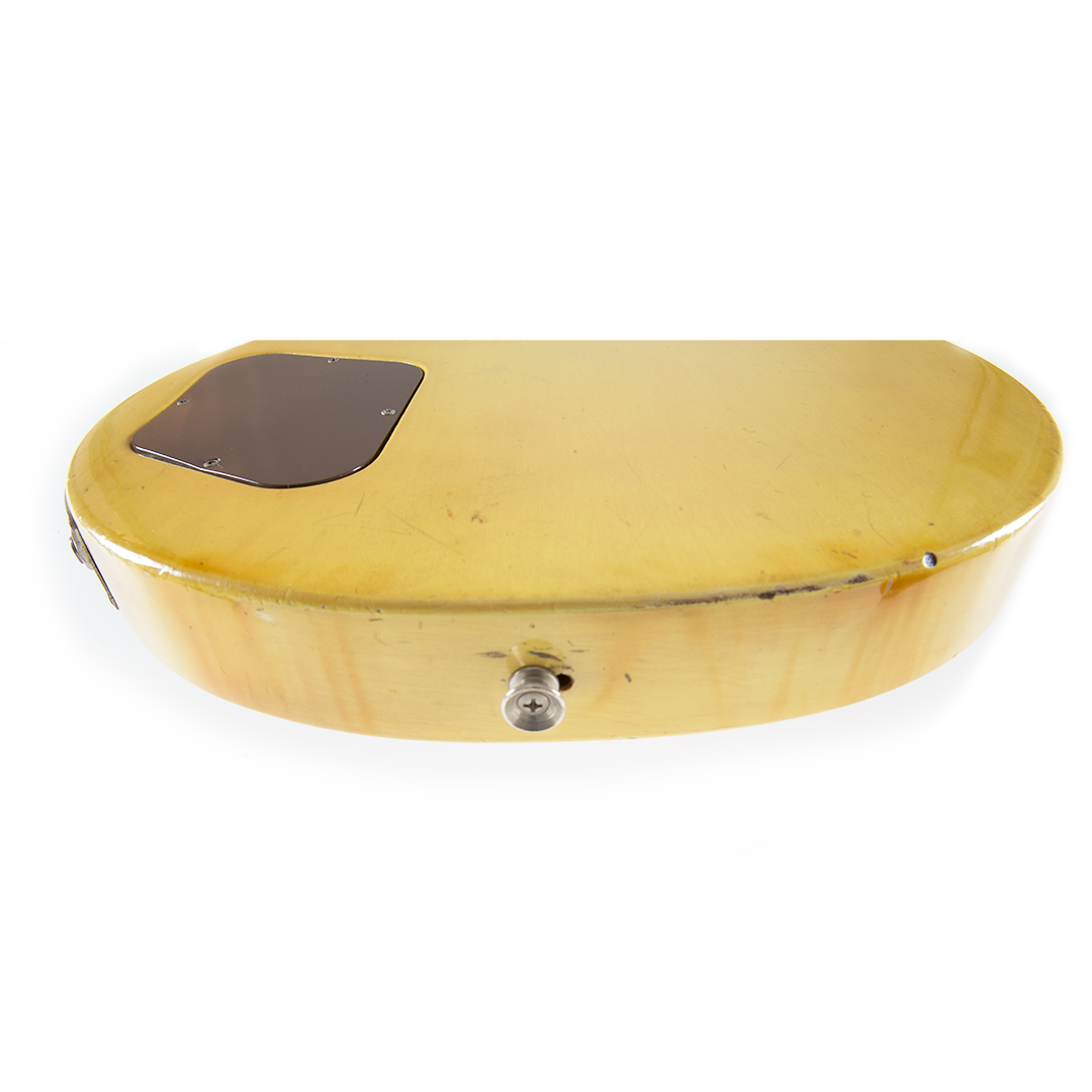 Here is the known history of this Les Paul Special, including all known alterations. This guitar was purchased at a music store in Charleston, South Carolina in the early 1990s. At the time of purchase, the original tuning pegs of the headstock had already been replaced by the extant Grover tuners. Also, the peg to which a guitar strap is attached, on the top of the body, had been moved closer to the neck, leaving a small circular hole. This hole has since been filled by a local Athens luthier, around 2014. Apparently, when the guitar-strap peg at the top of the body was moved, the matching one on the tailpiece of the guitar body was also moved, although more efficiently. The older guitar-strap peg hole of the tail is subtle, but still slightly visible. Both the Grover tuning pegs and the relocated guitar-strap pegs can be seen in the photographs above.