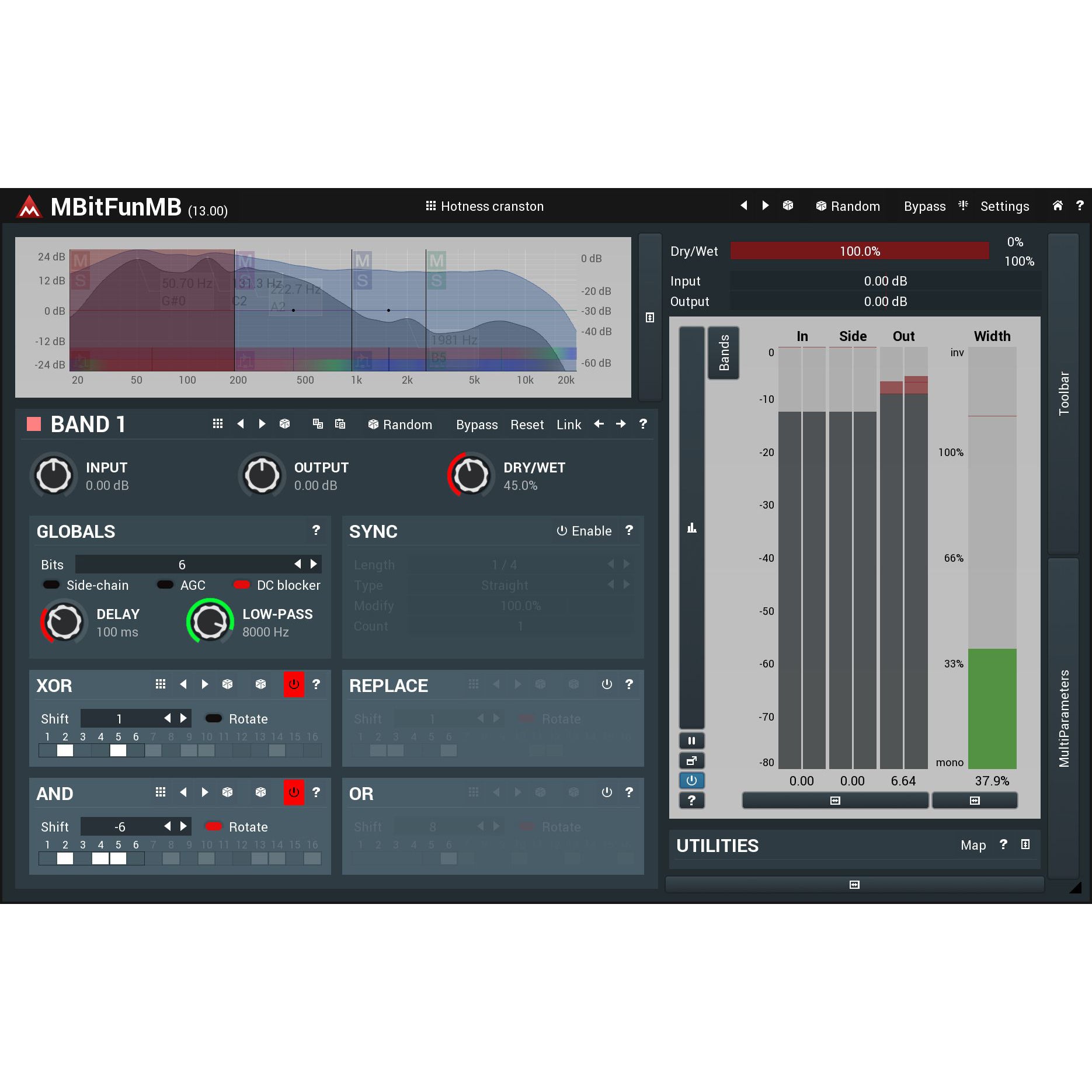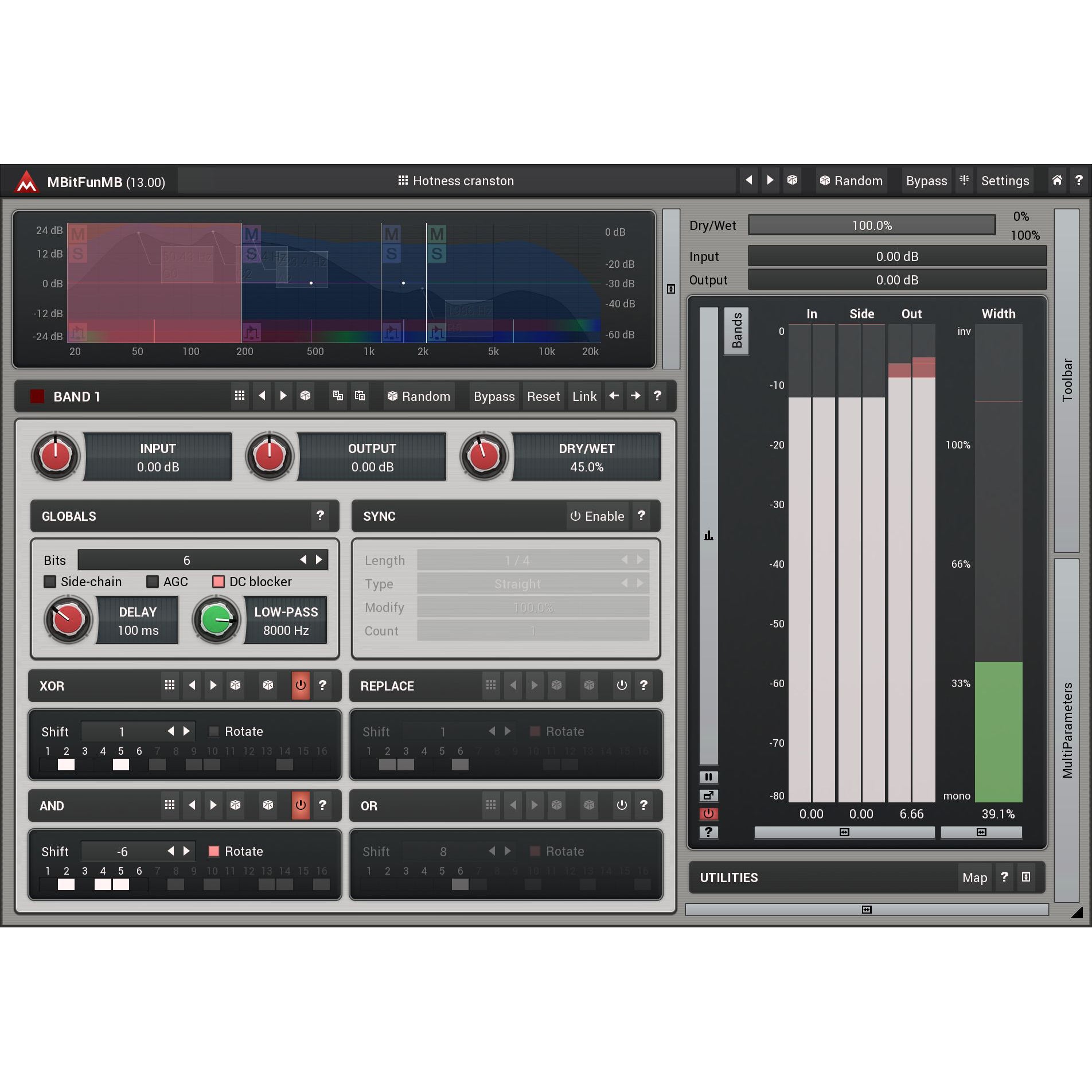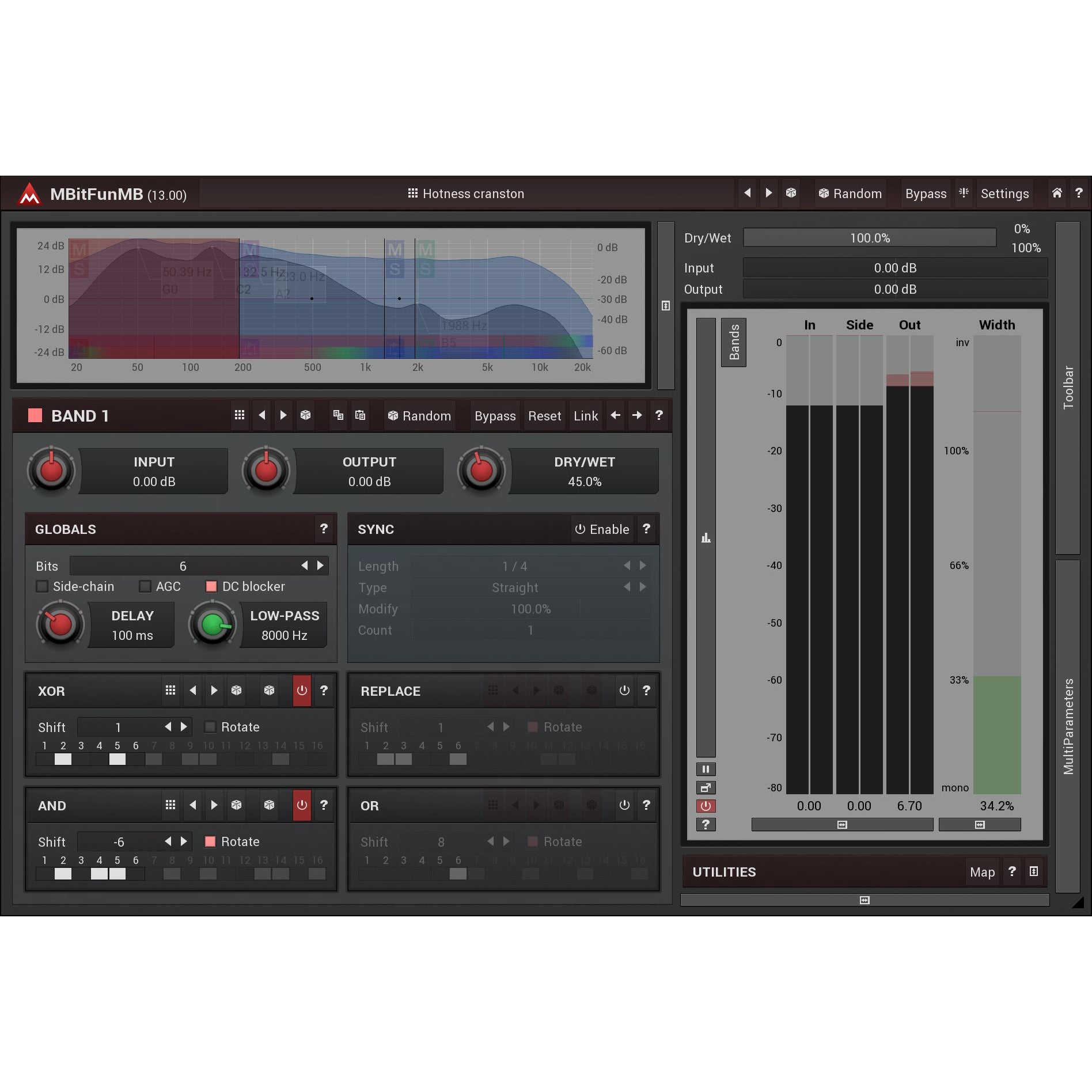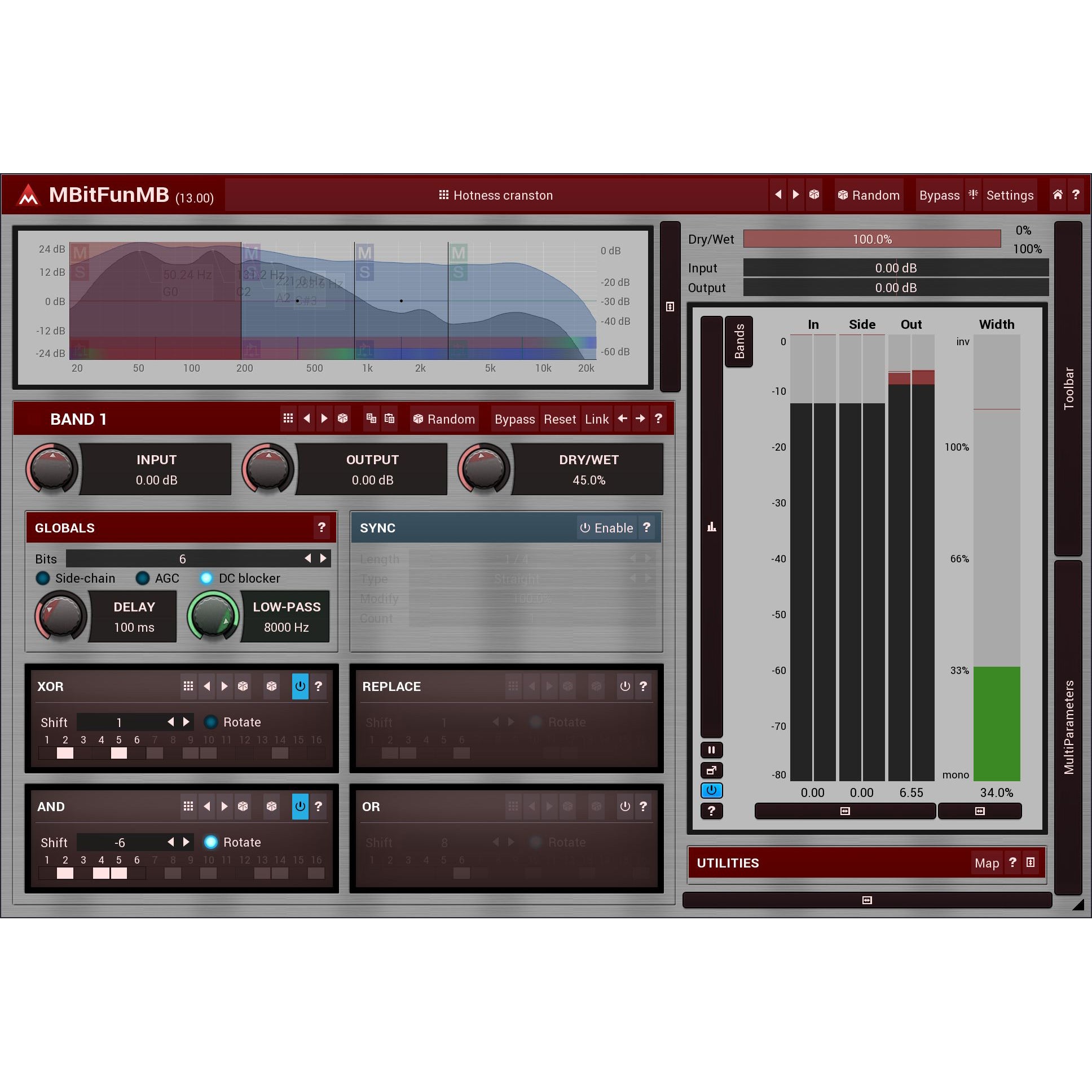 MBitFunMB is a serious tool for extreme distortion lovers. It converts the incoming audio into limited fixed-point precision data of 1-16 bits per sample and lets you access each bit with several bit-manipulation operations and finishes the processing with a low-pass filter. All with up to 6 independent frequency bands, 4 modulators.
