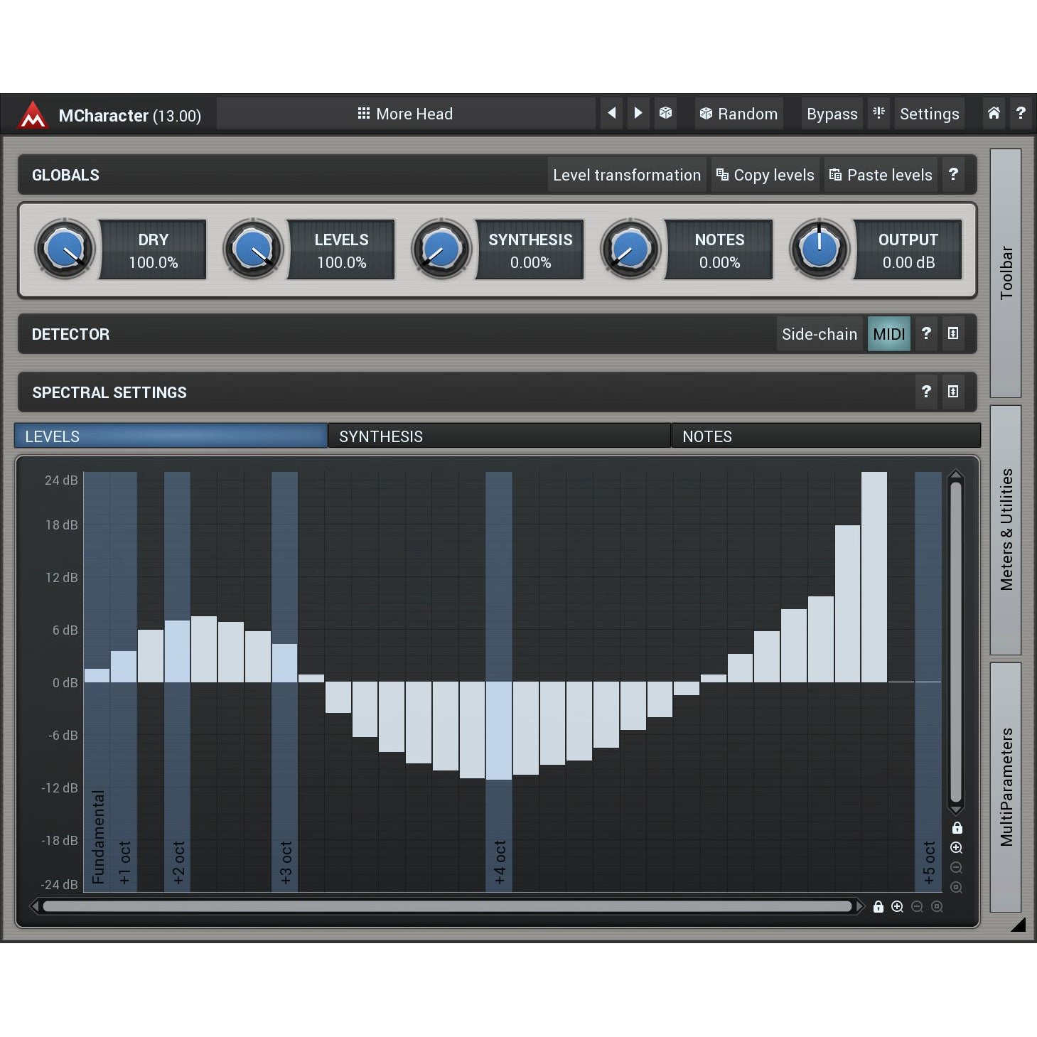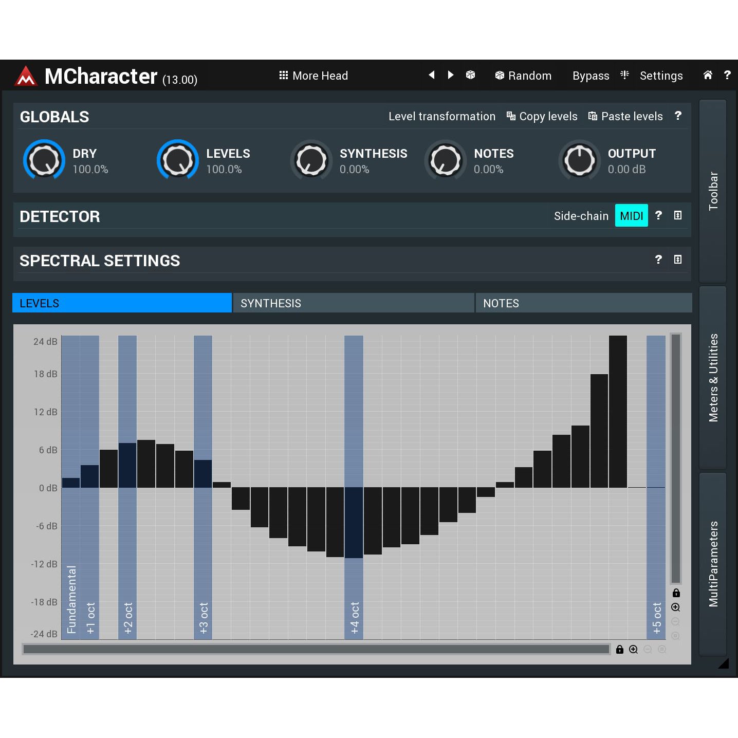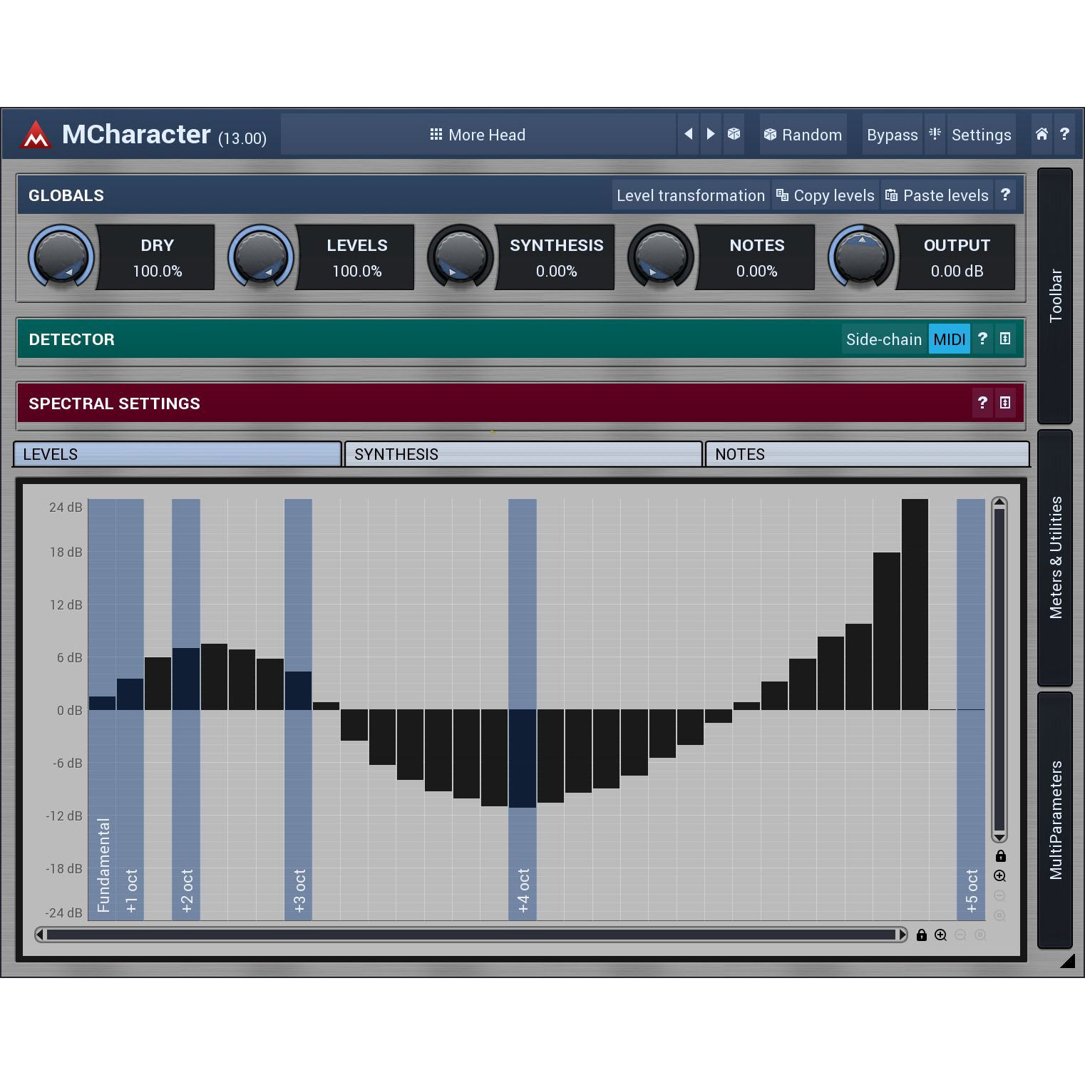 Powerful synthesis. What happens if some harmonics are not present at all in the audio? Or, perhaps, you want to generate a sub-octave? Well, up to now it was pretty much impossible, but MCharacter makes this very simple. It lets you synthesize harmonics & tones that are not there using 2 simple graphs. Just say which harmonics and how much you want of each!