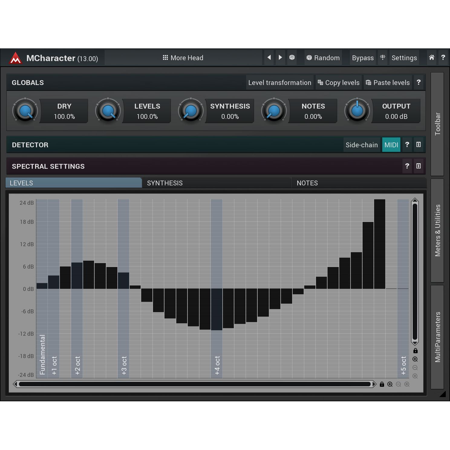 Direct access to the instrument's harmonics. Most audio instruments have a distinctive character defined by harmonics and formants. Formants are pretty much static in the audio spectrum, so you can change them directly with an equalizer. Harmonics, however, are more problematic, because they follow the pitch. MCharacter lets you control the levels of first 32 harmonics in a very simple and effective way. By working directly in the spectral domain the plugin's ability to detect pitch is outstanding and the changes are instant, which makes it outperform traditional equalizers in just about every way.