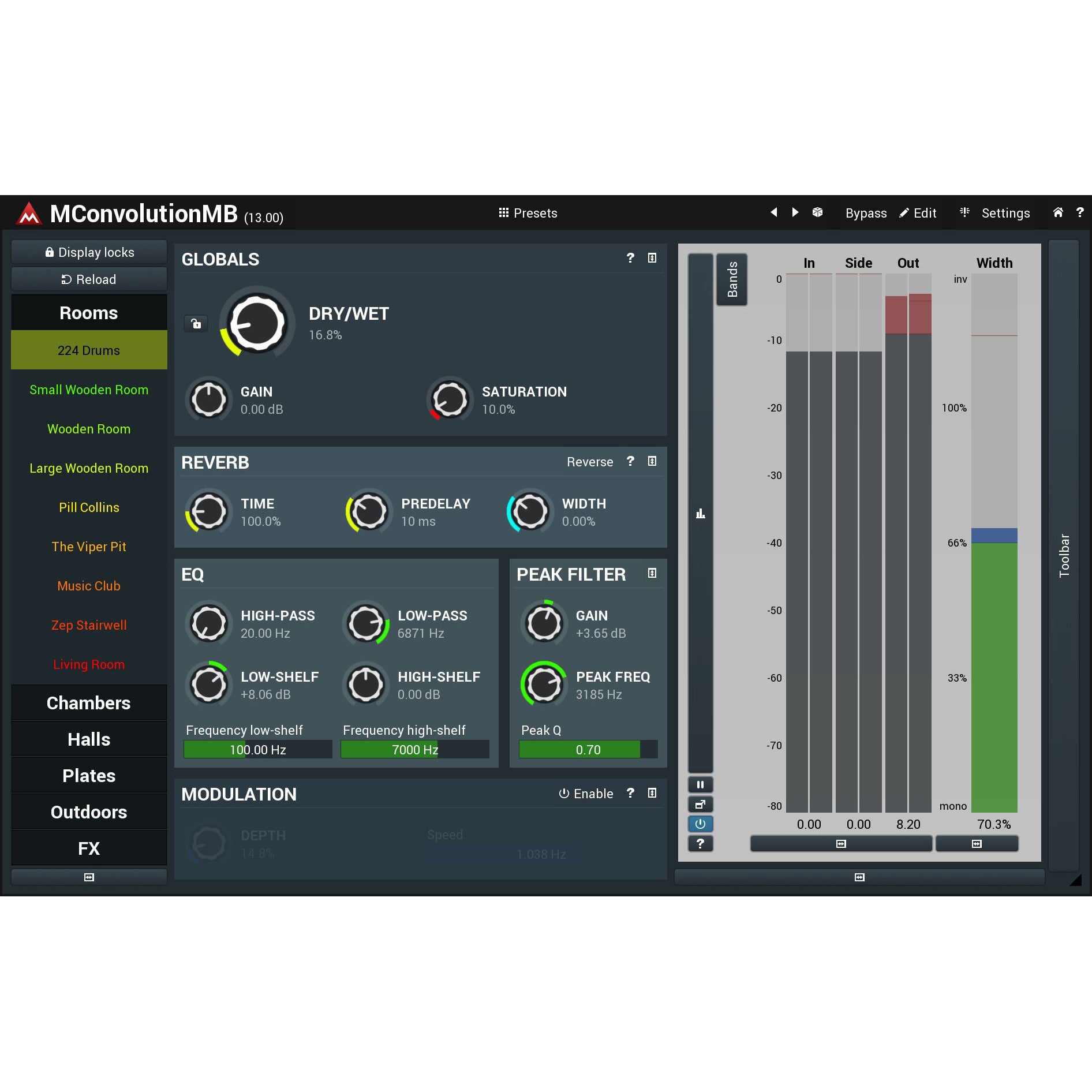 2 impulse responses per band plus modulation. Each band can have 2 IR generators of any type (file, reverb or filter) and using a simple slider you can control the ratio between these two to create extremely realistic dynamic reverbs. By attaching the slider to one of the modulators you can easily make this process completely automatic yet extremely versatile.