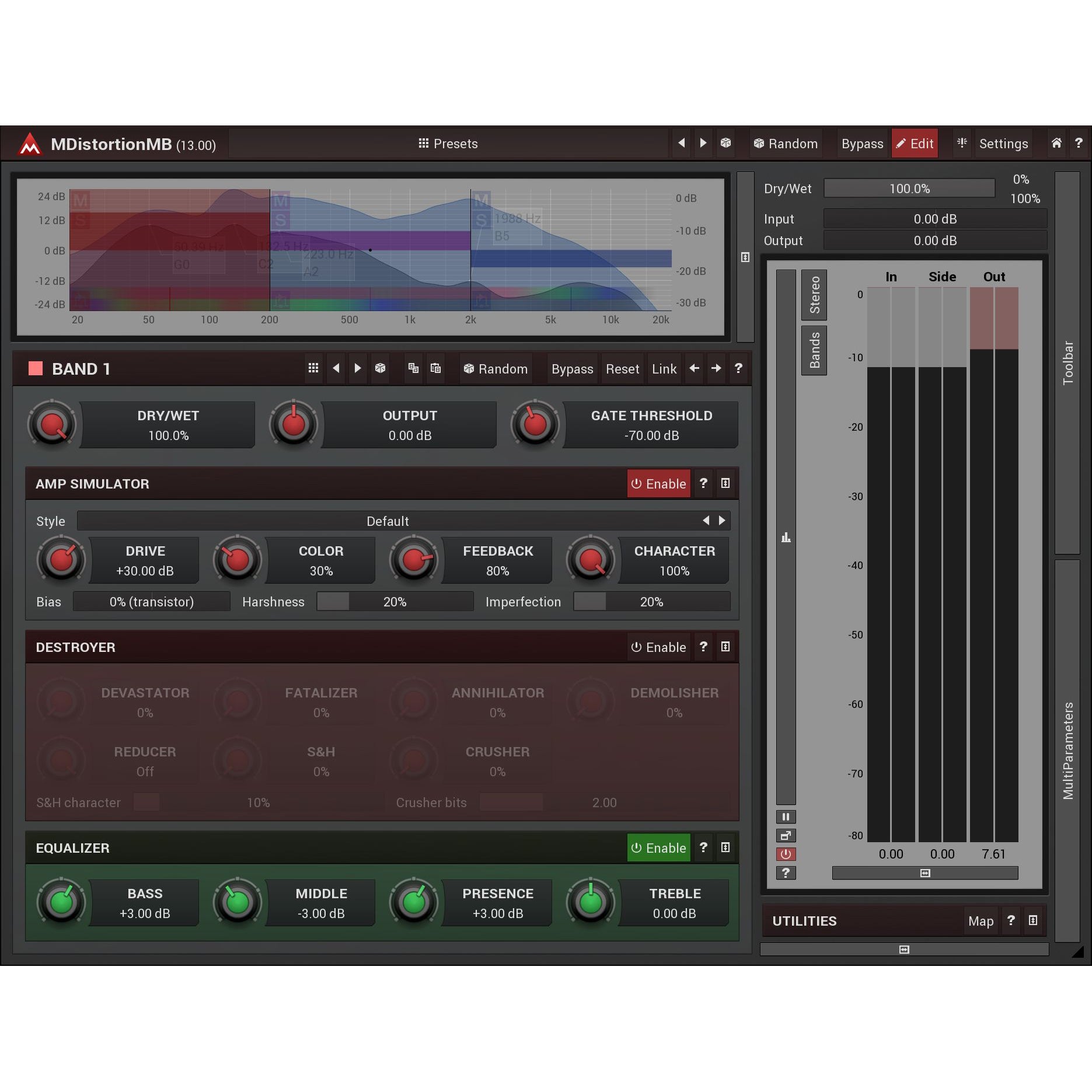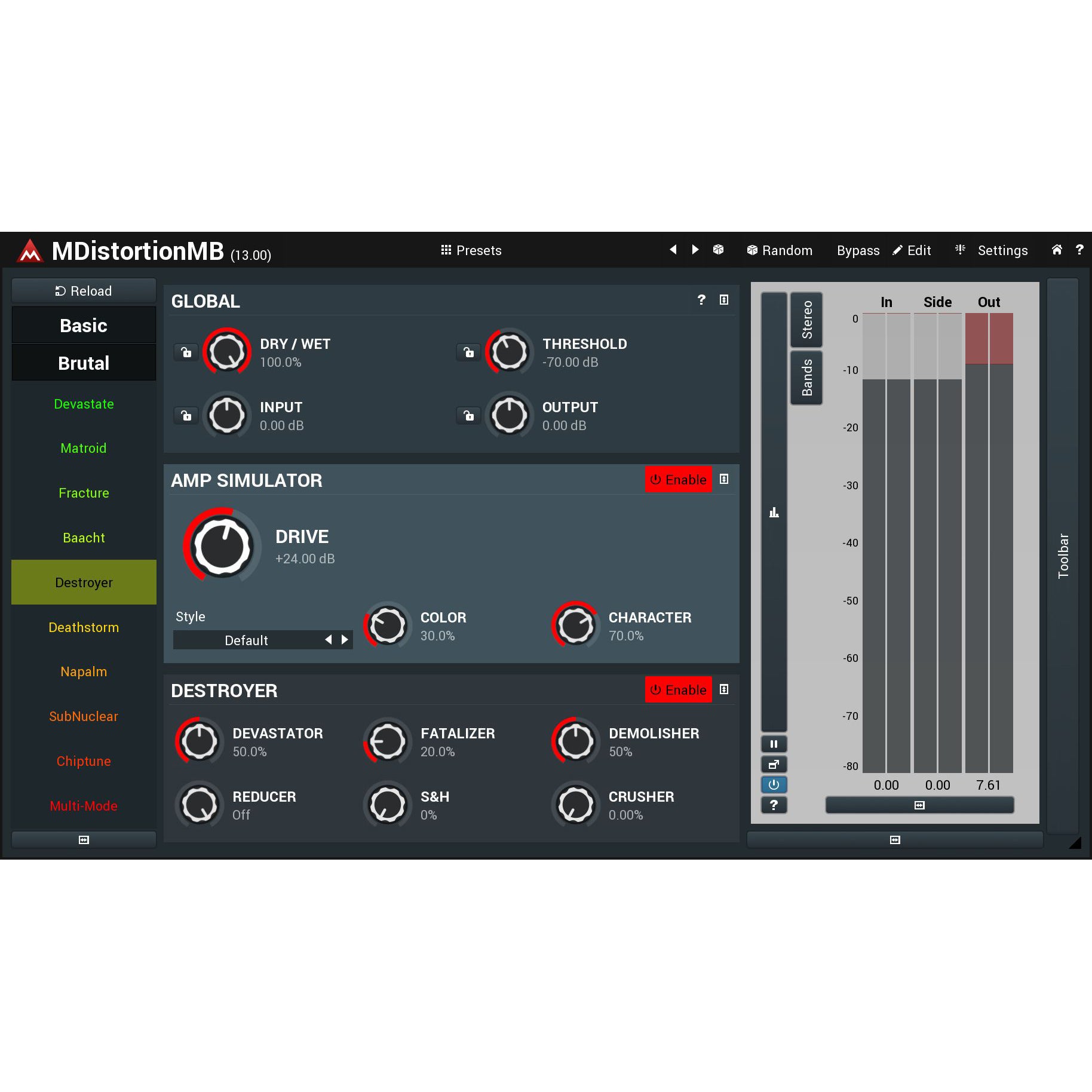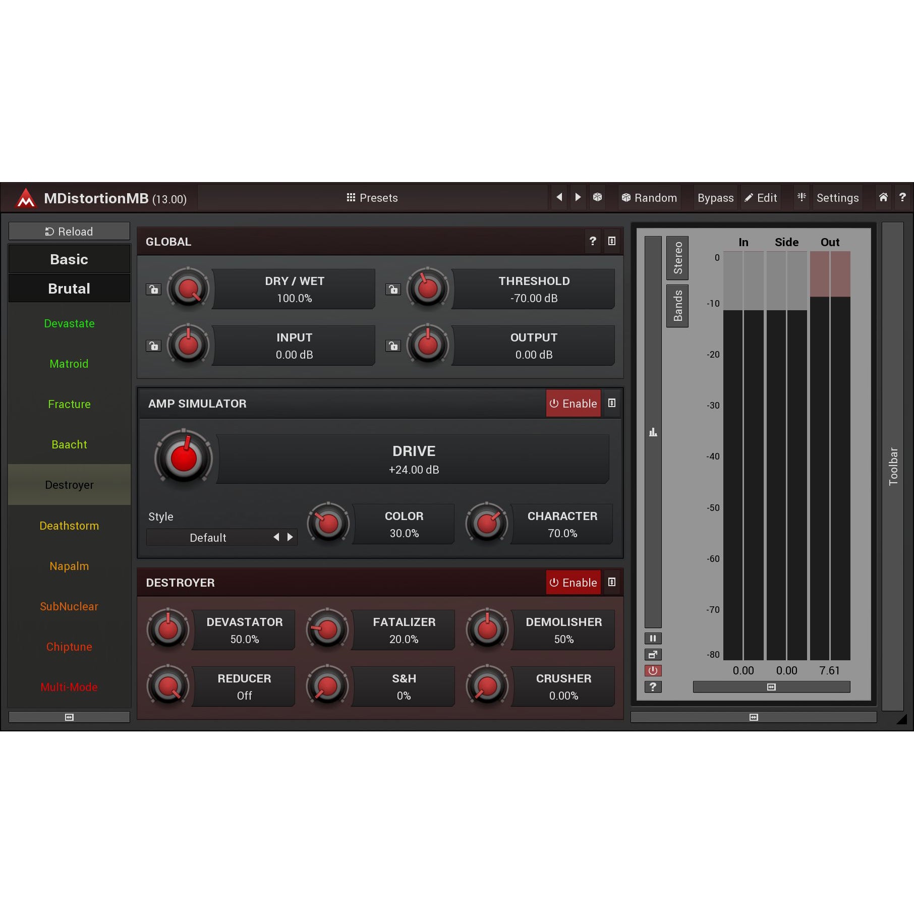 MDistortionMB is a unique distortion plugin combining a generalized amp simulator with a digital distortion processor. It combines the best from the analogue and digital worlds and is perfect for guitars, keyboards, drums or even just sound mangling.
