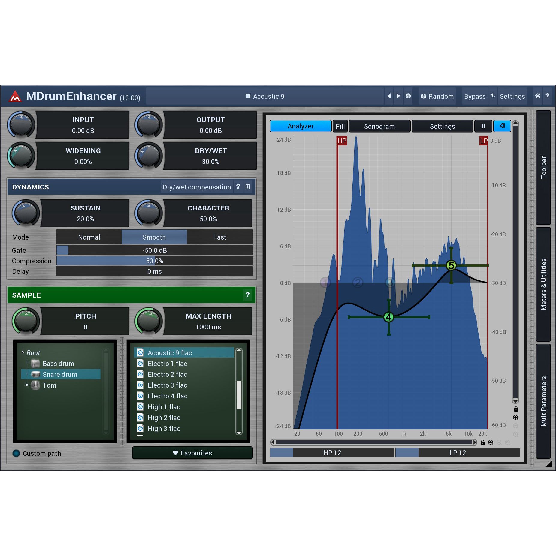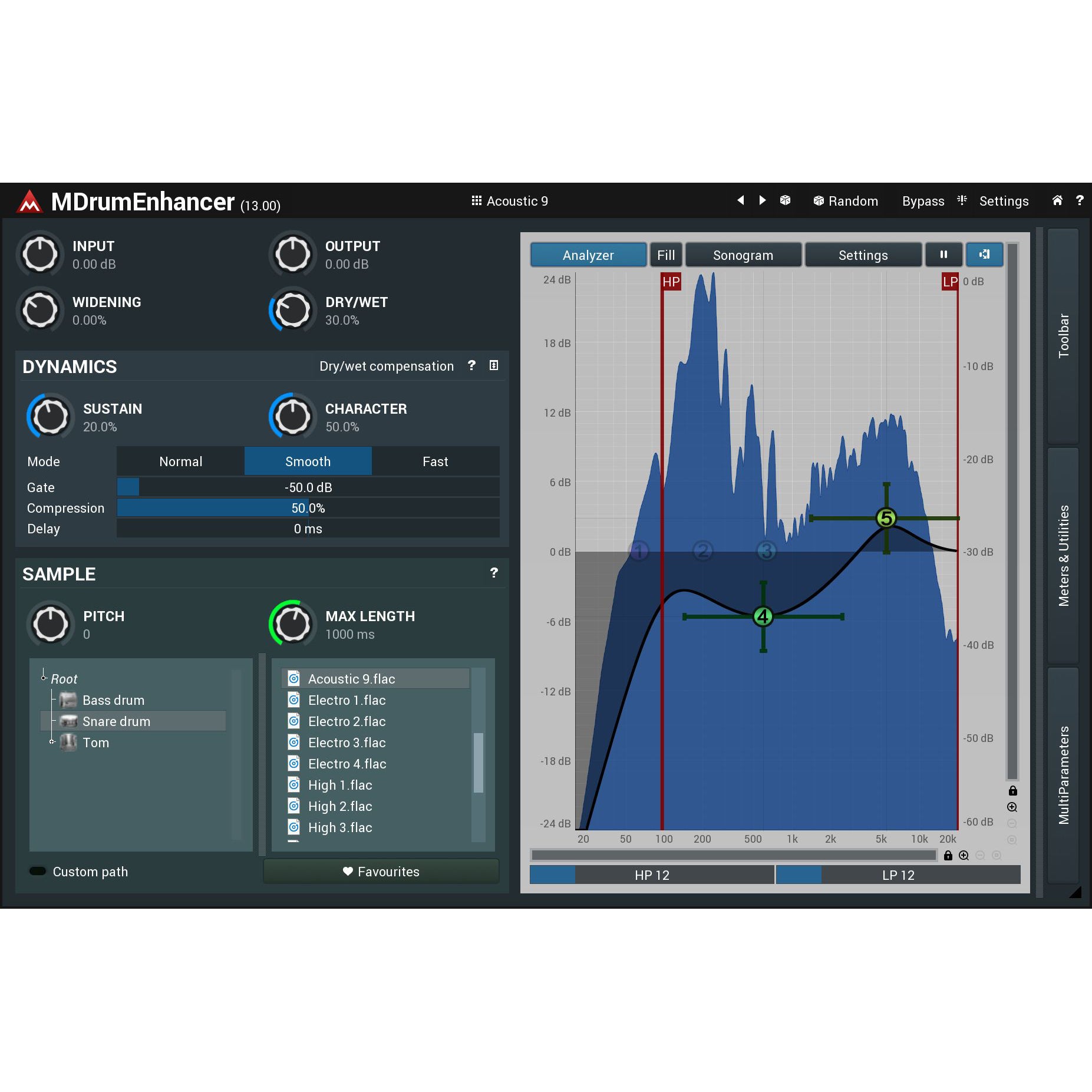 MDrumEnhancer is a unique tool that follows your drum track and synthesizes its own additional signal using samples to make it sound big and phat, without any of the problems that arise from traditional drum replacement. Add snare noises, improve bass drum's boom or snap, or even resynthesize the sound completely.