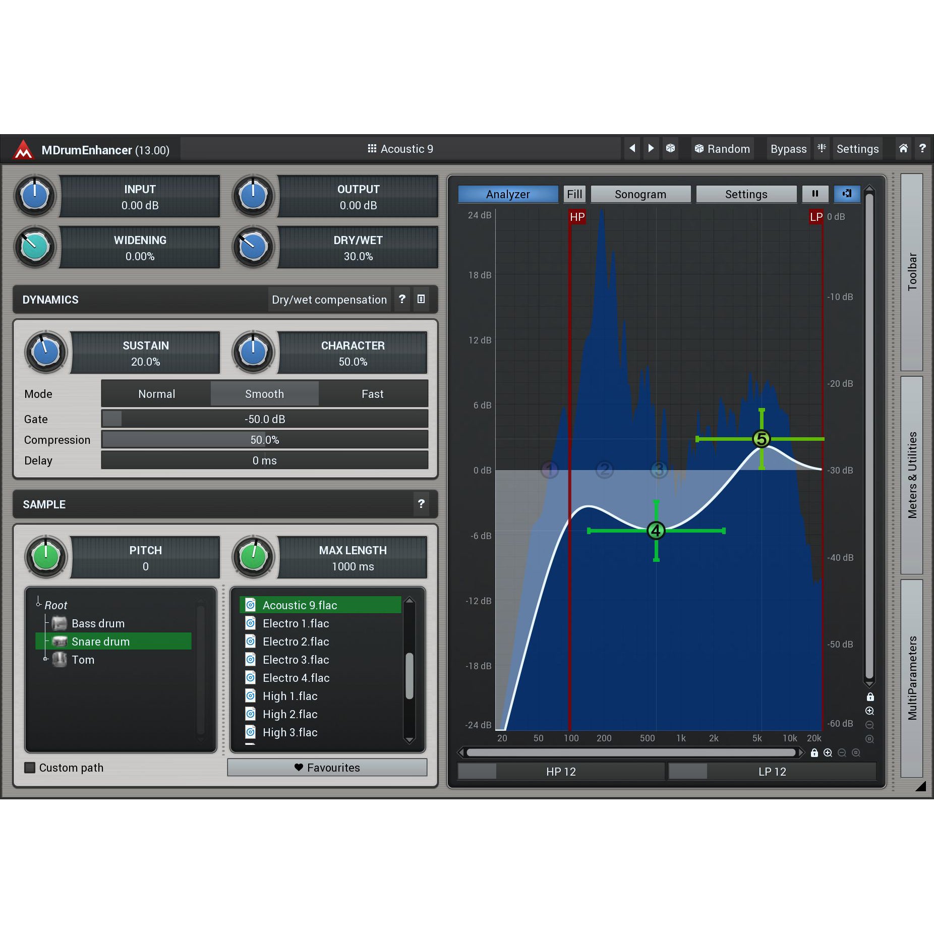 It can blend with any material. MDrumEnhancer is quite a straightforward plugin to use, but ithas enough controls to let you fine-tune it for any material. You can change the pitch of the samples to tune it to your drum track, it has a full dynamic equalizer so you can tweak the spectrum of the enhancement signal, sustain control lets you make the drum hits shorter but also longer than they actually are and even provide cool reverberation.