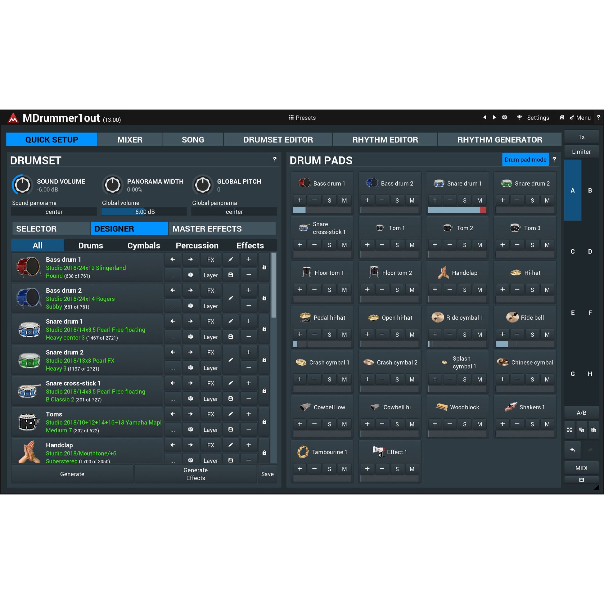 Quick and inspiring. MDrummer can generate infinite number of new drum sets by pressing a single button, analyze and import your sample libraries, merge multiple drum sets and much more. MDrummer is perfect whether you are looking for a traditional style, a truly unique sound available by a few clicks, or if you are ready to get dirty and explore the depths of the most advanced drum machine in the world.