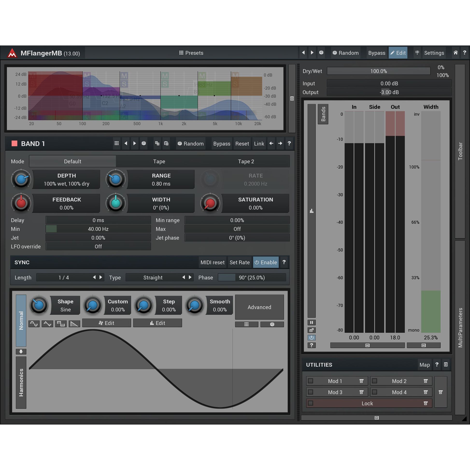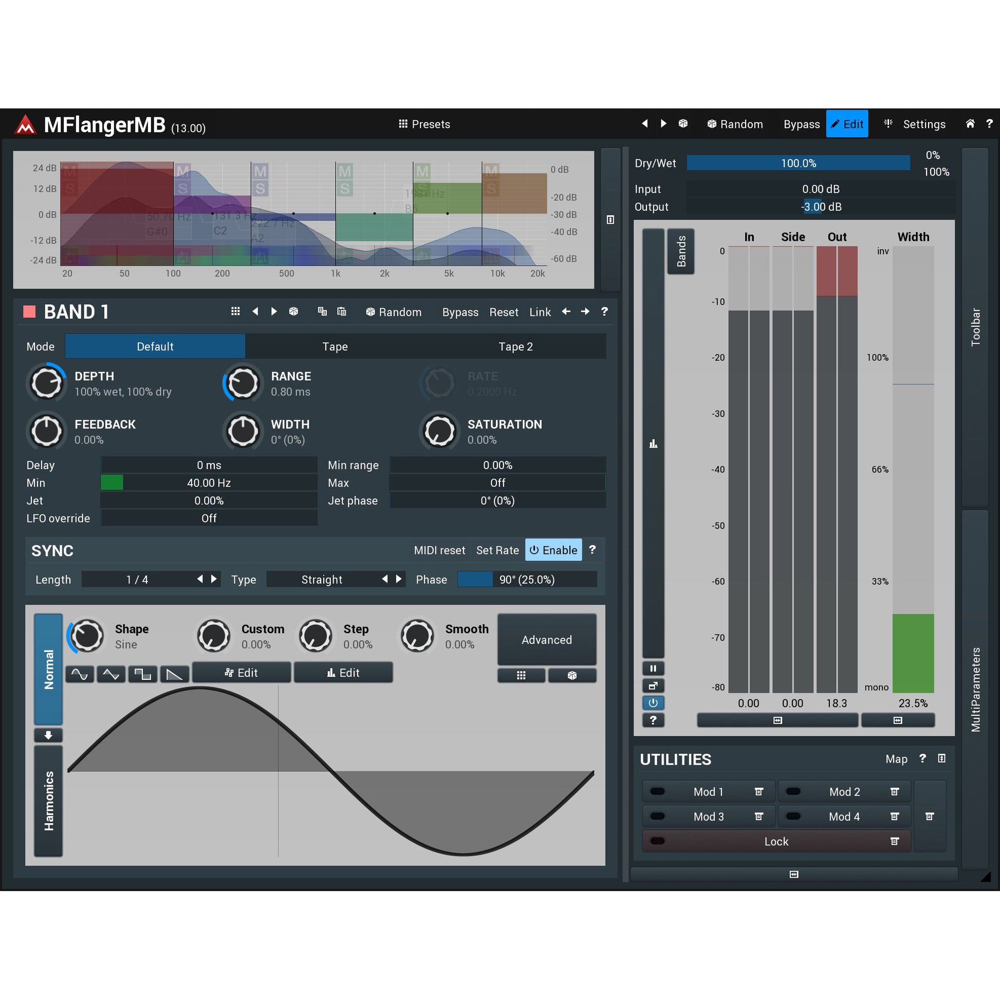 6 bands with custom shape and other advanced features. MFlangerMB provides way more than common flanger effects. Features such as custom oscillator shapes, analog-like saturation, jet (additional tremolo), synchronization you can rarely find anywhere-else. And with 6 bands you can really start being creative.