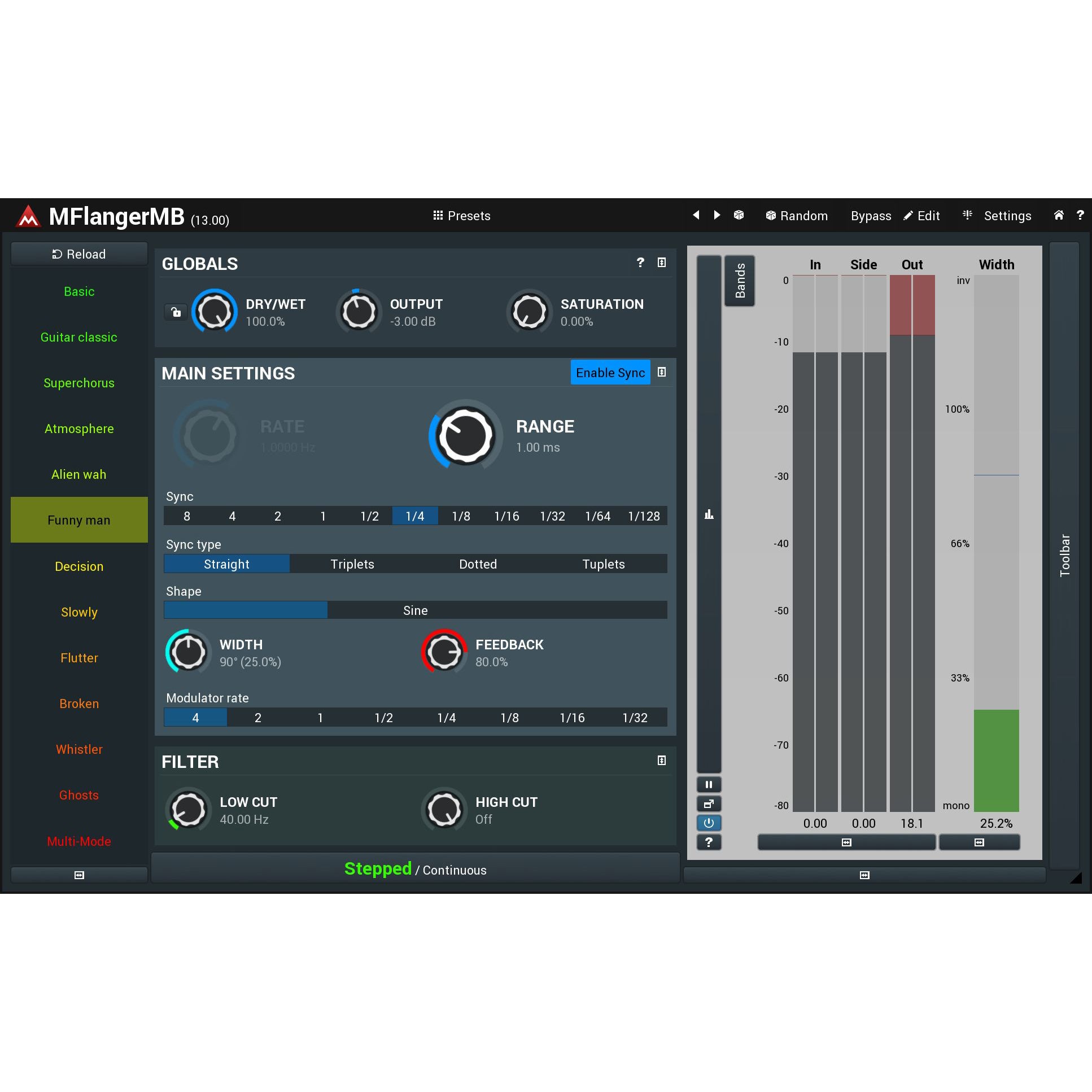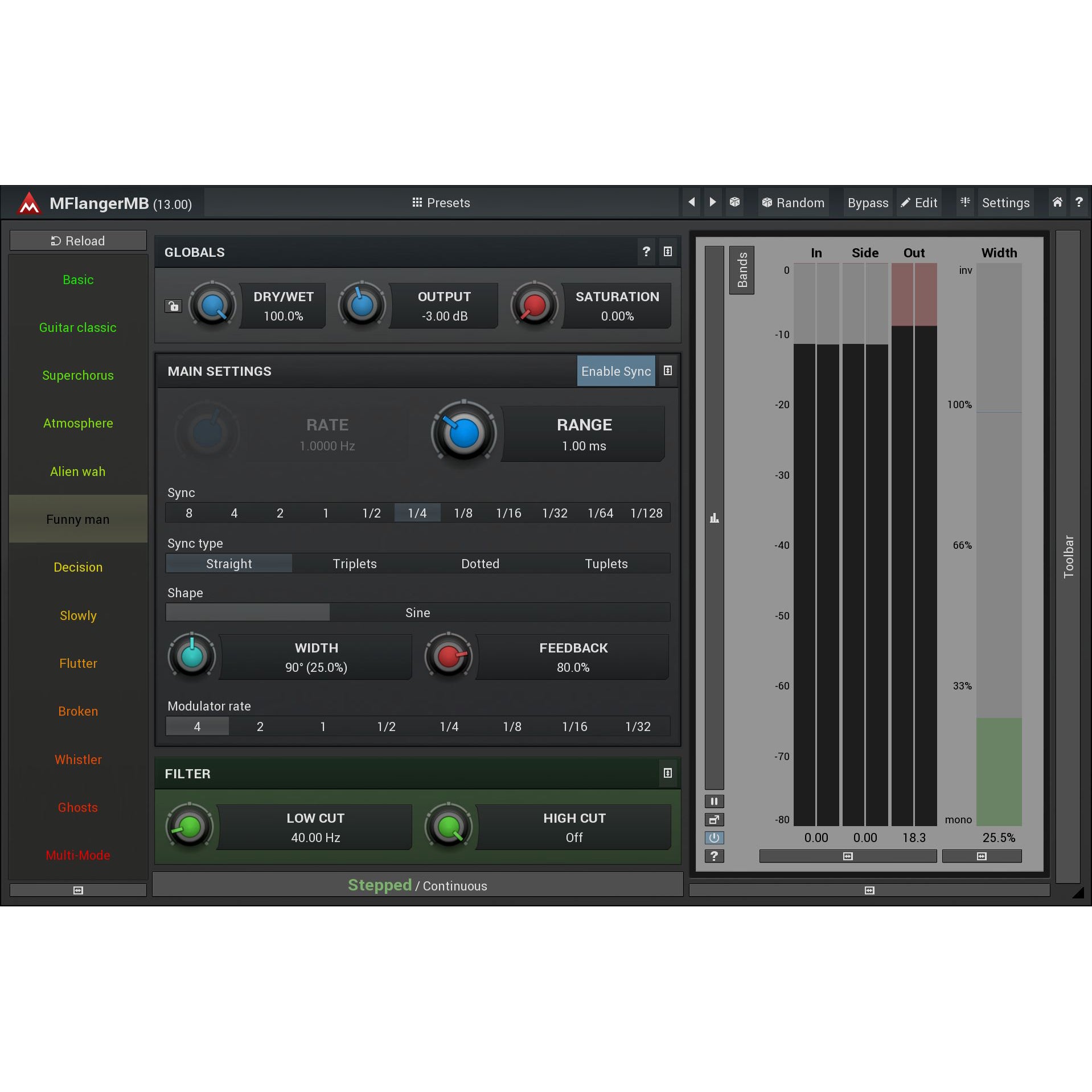 Flangers are tools with a specific character and are indispensable for guitars, and a wide range of other instruments. MFlangerMB is the top class representative, which will beat every other flanger on the market in terms of both audio quality and features.
