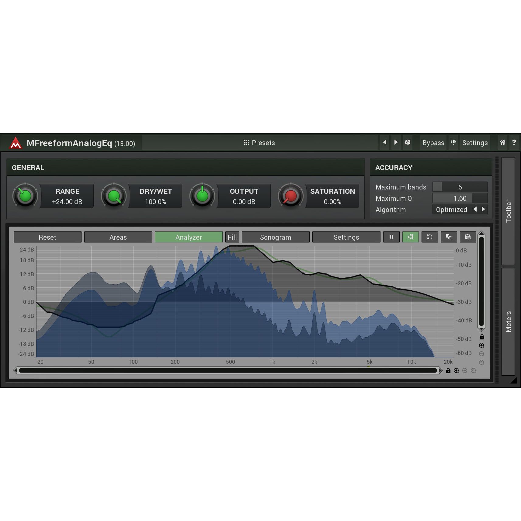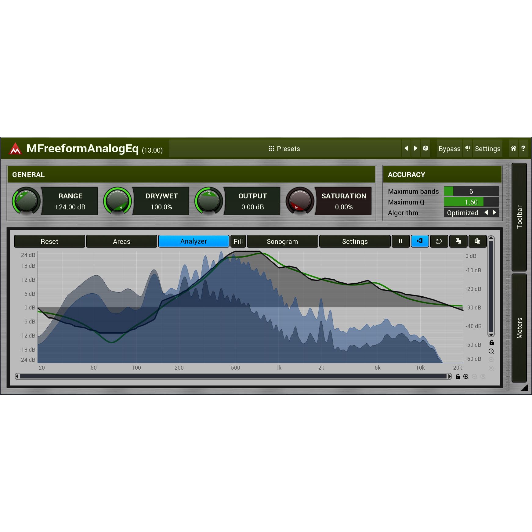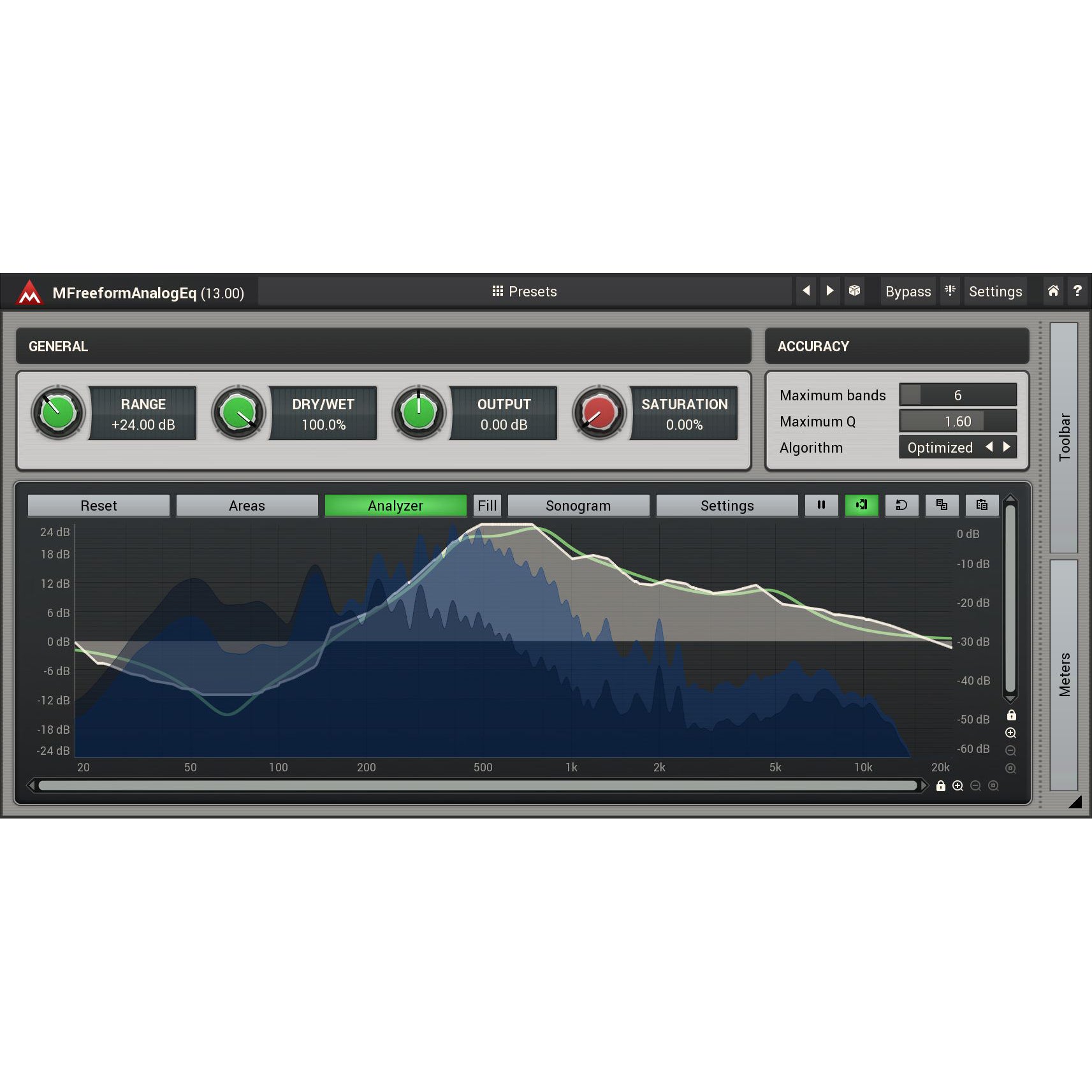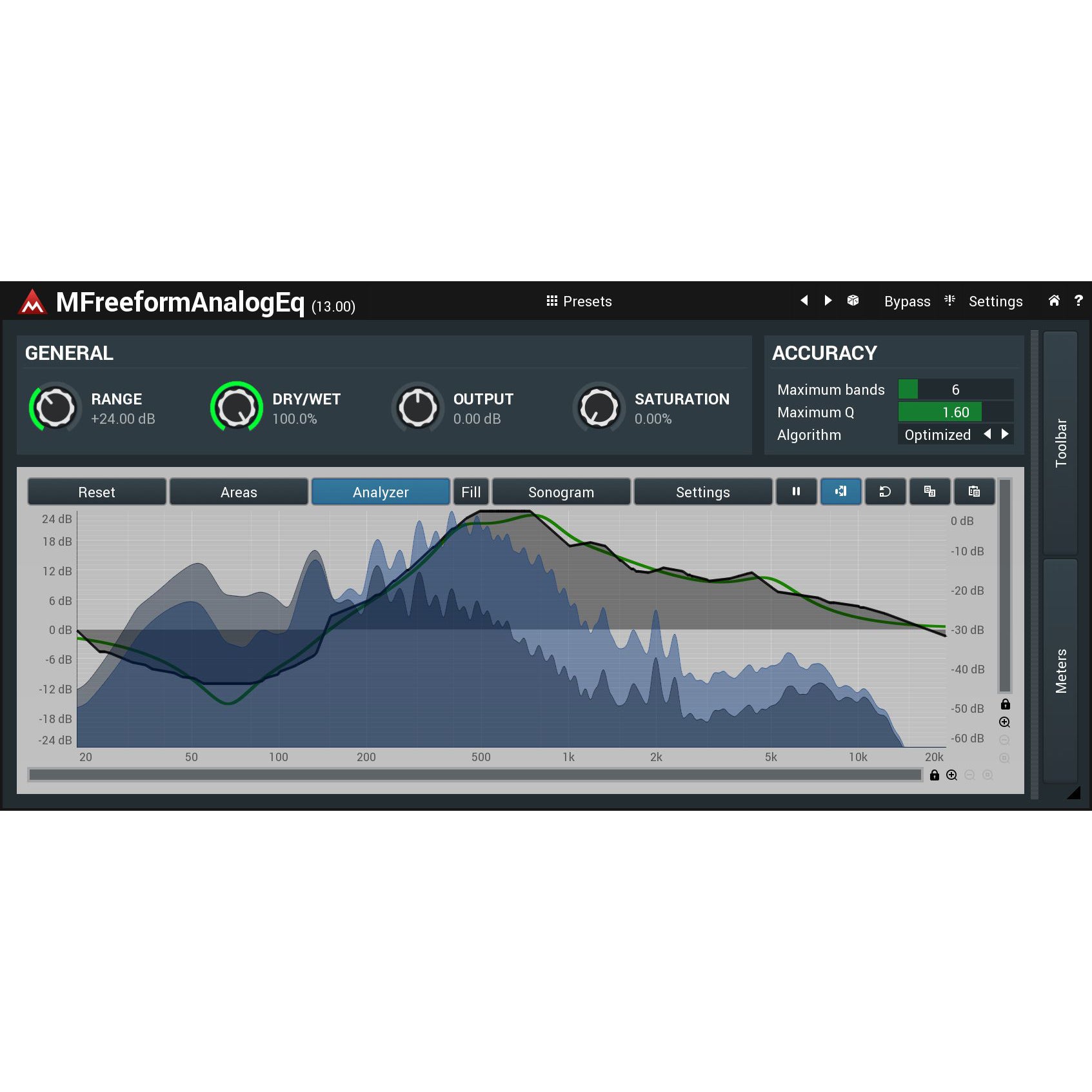 Freeform filter-based equalization. MFreeformAnalogEq uses our filter-adaptation technology to make your dreams come true - no more messing about with the settings of multiple parametric filters. Just draw what you want and the plugin finds the most accurate settings for the parametric filters. And it sounds great!