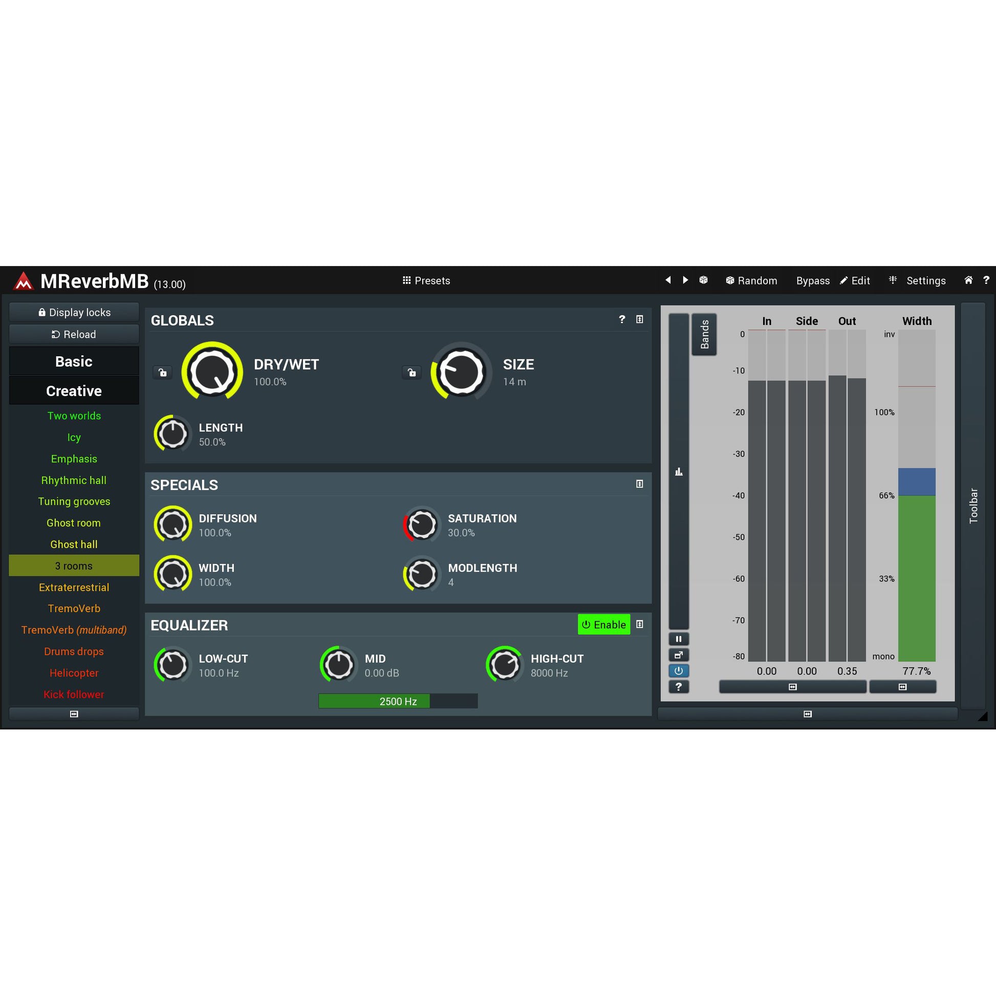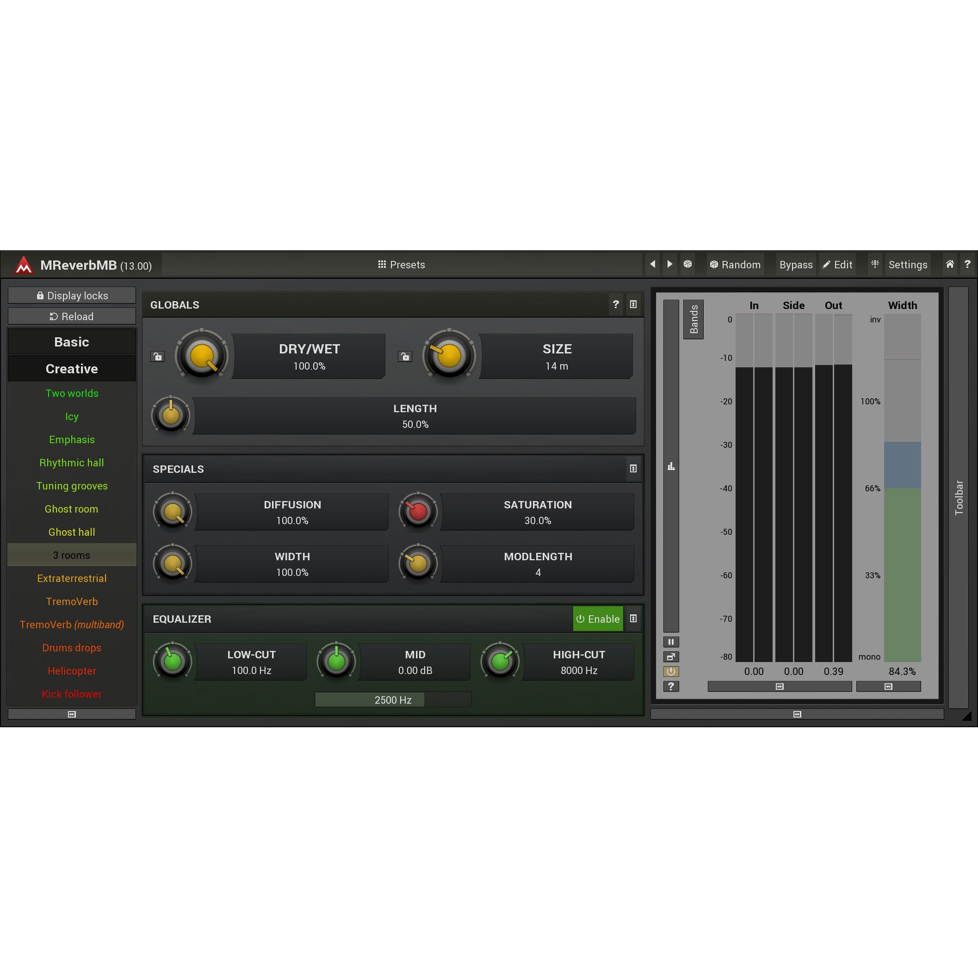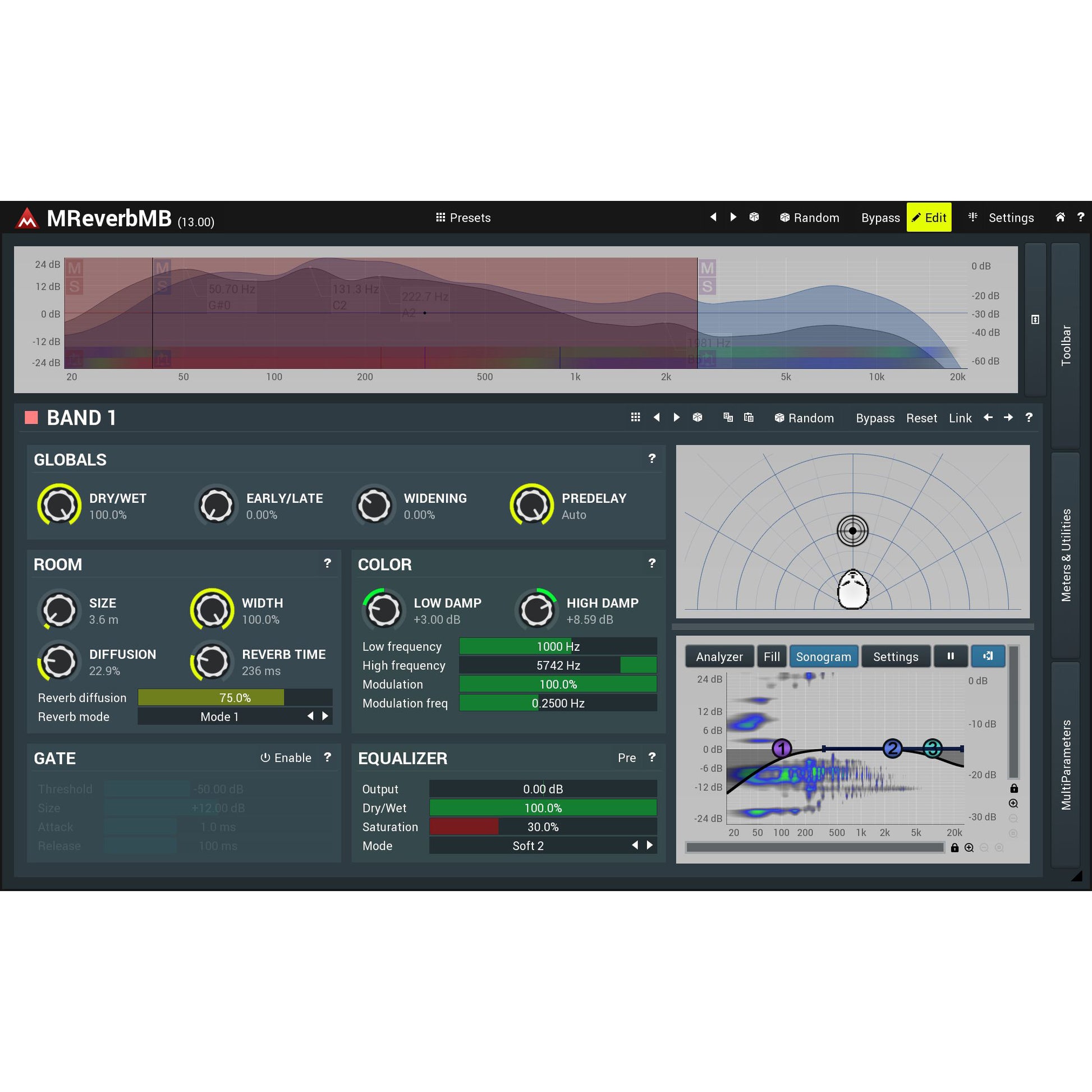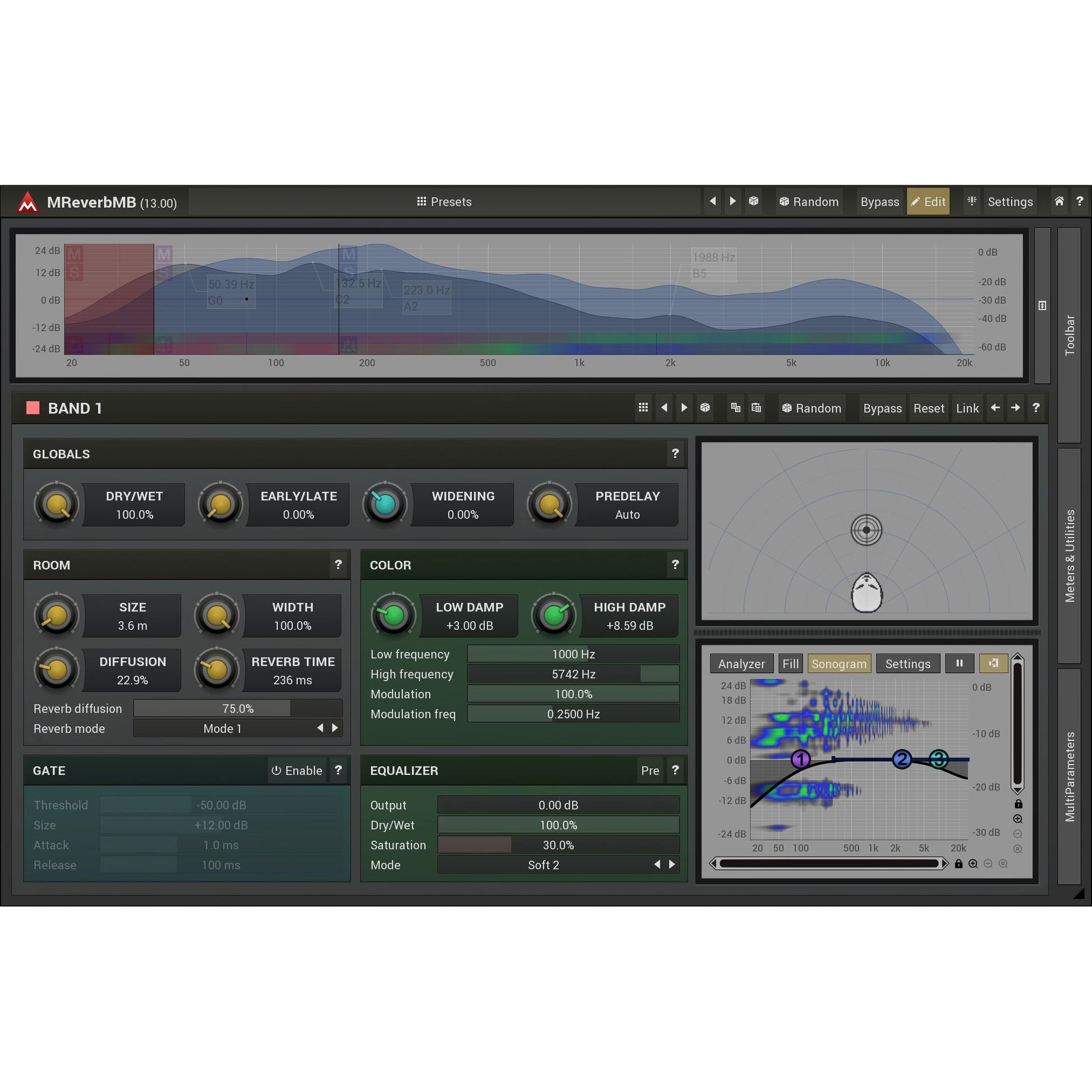 MReverbMB extends the possibilities well beyond that of standard quality reverbs by allowing you to process up to 6 distinct bands simultaneously. This reverb plugin can provide everything from extremely realistic halls to unbelievable effects.