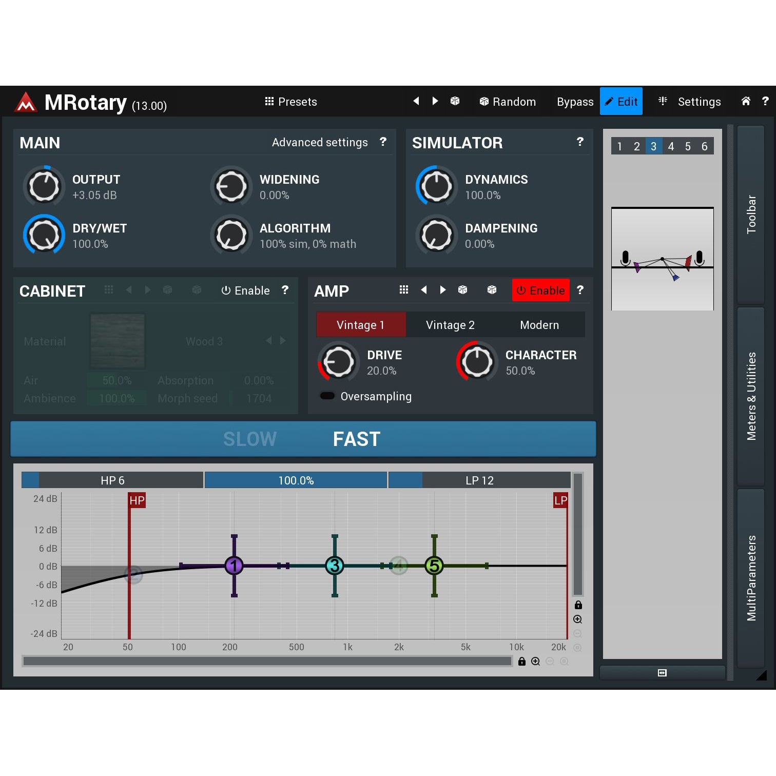 MRotary is the ultimate rotary simulator, which can deliver not only the great vintage sound , but also futuristic algorithmic sound featuring up to 6 speakers at once. You can design your own cabinet using any material from wood to glass , process the rotary signal using fully featured dynamic equalizer and much more.