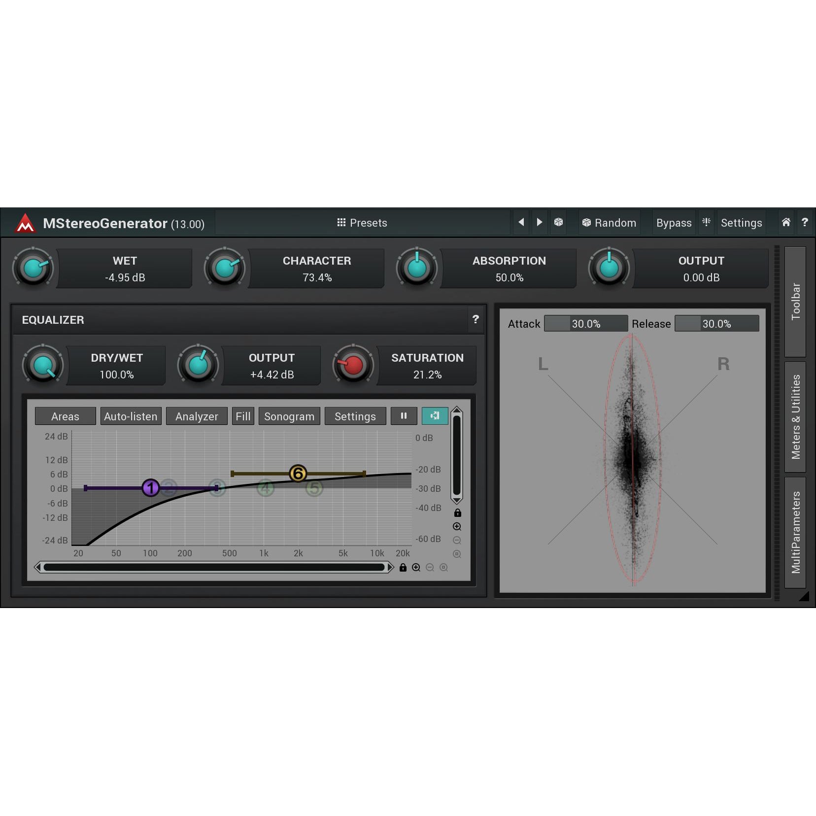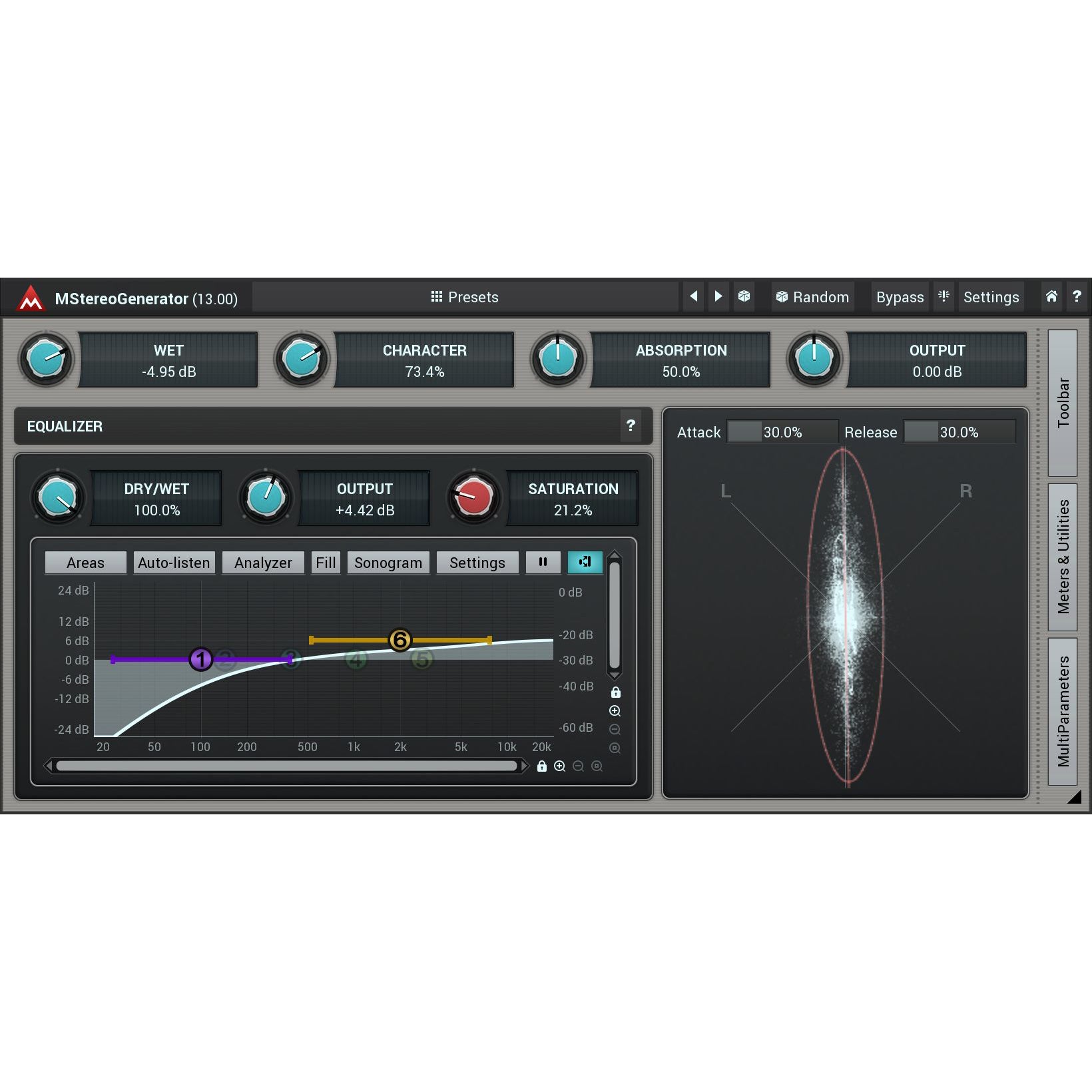 Fully featured parametric equalizer and stereo field analyzer. An integrated equalizer lets you adjust which parts of the spectrum you want to expand and the stereo scope gives you an immediate view of the resulting stereo width.