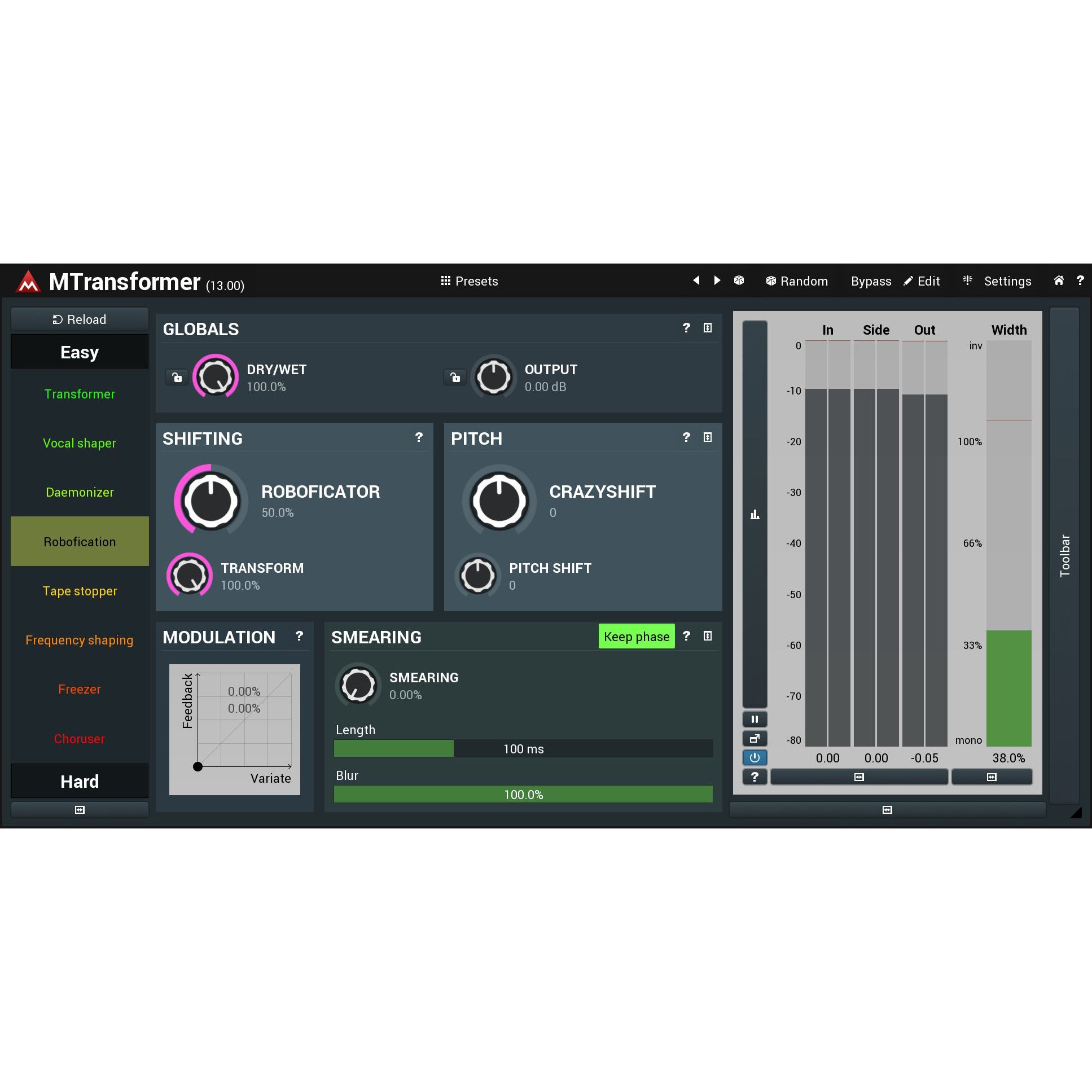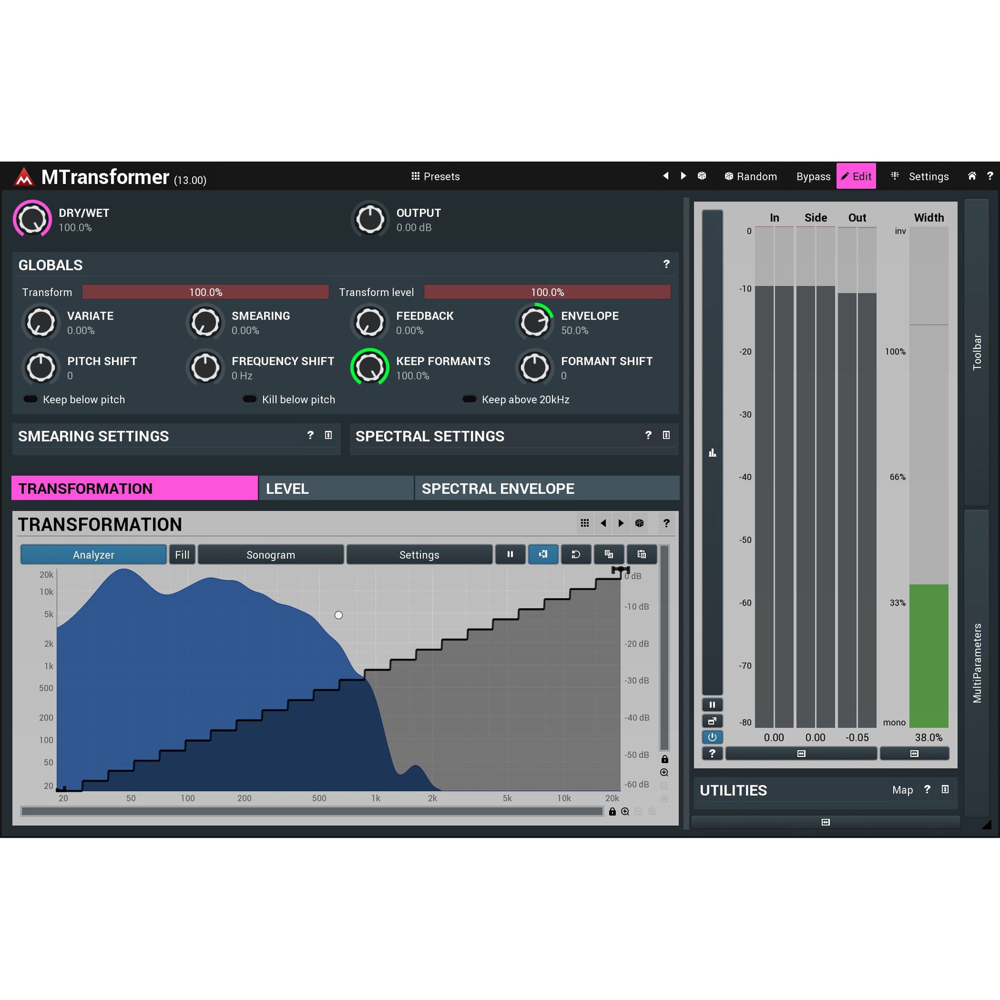 Pitch shifting, frequency shifting, daemonic and robotic voices... that's MTransformer, a unique spectral processor that lets you transform any frequency to any other, transform their levels.