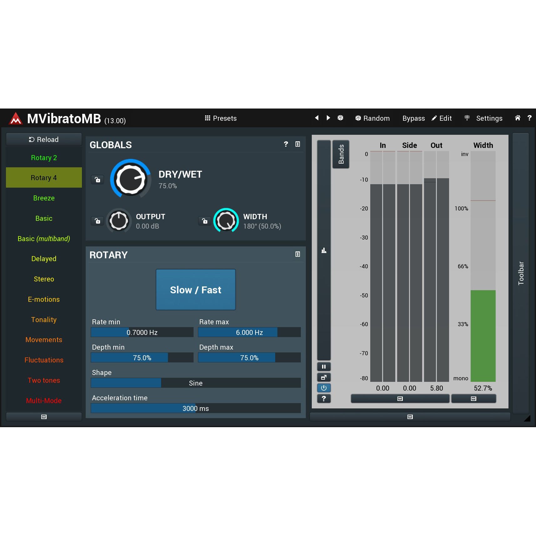 Powerful rotary simulation with astonishing audio quality. MVibratoMB combines the vibrato effect with a tremolo and multiband design. This provides enough power to build a 2-speaker rotary simulation, like the famous Leslie speaker. But why to stop there, when you can have a 6-band rotary! With up to 16x upsampling and sinc-interpolation MVibratoMB is simply the best sounding rotary simulator on the market.