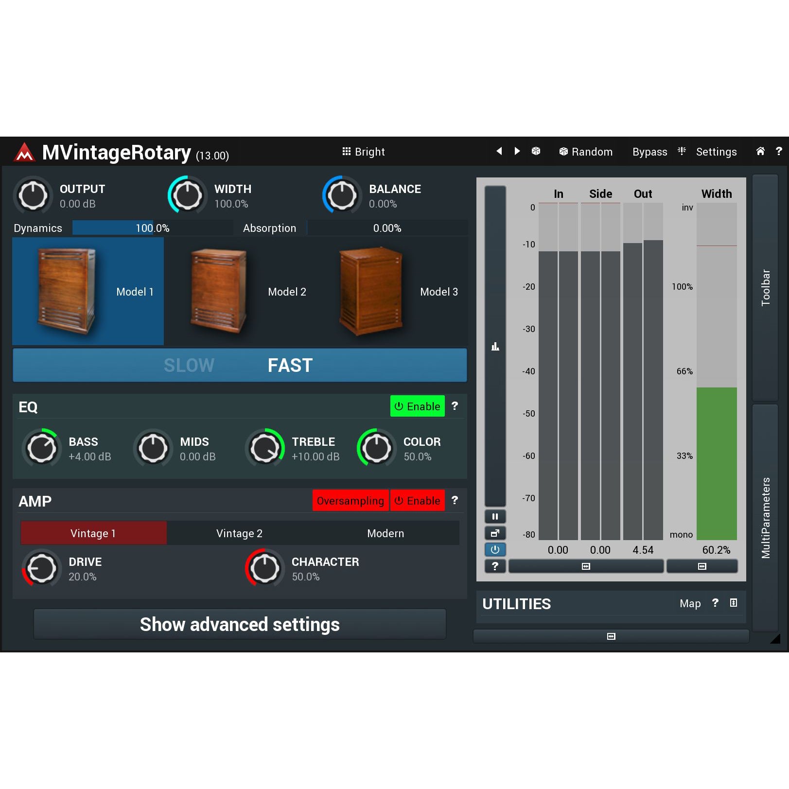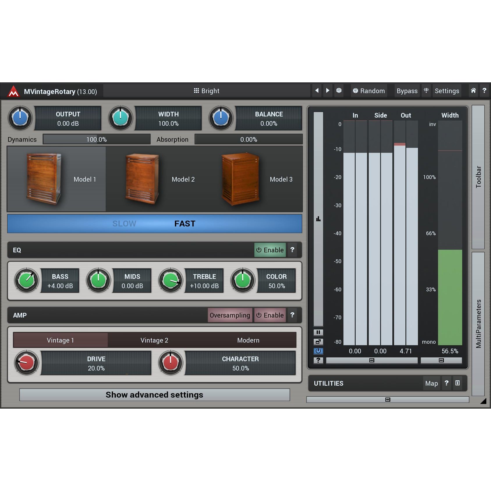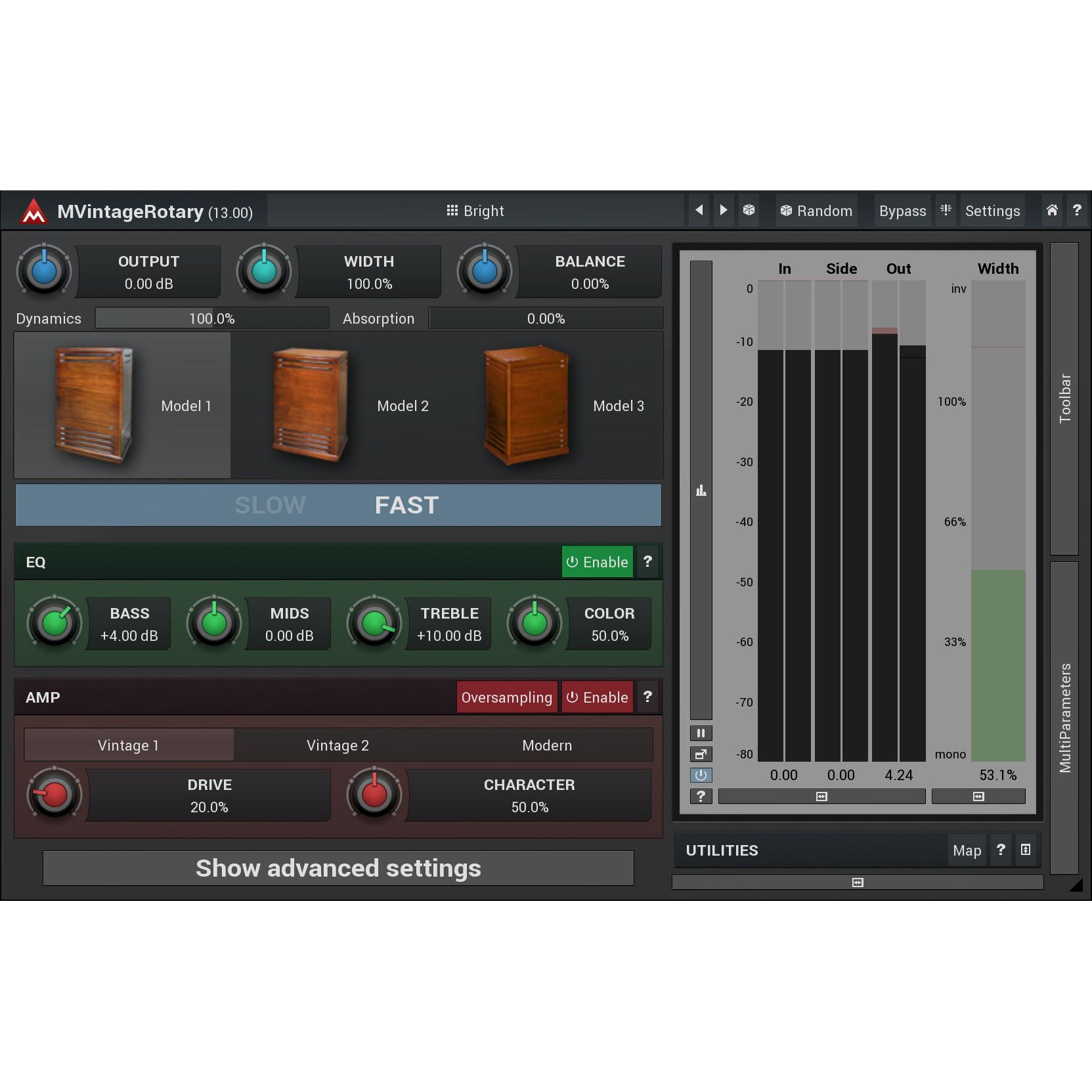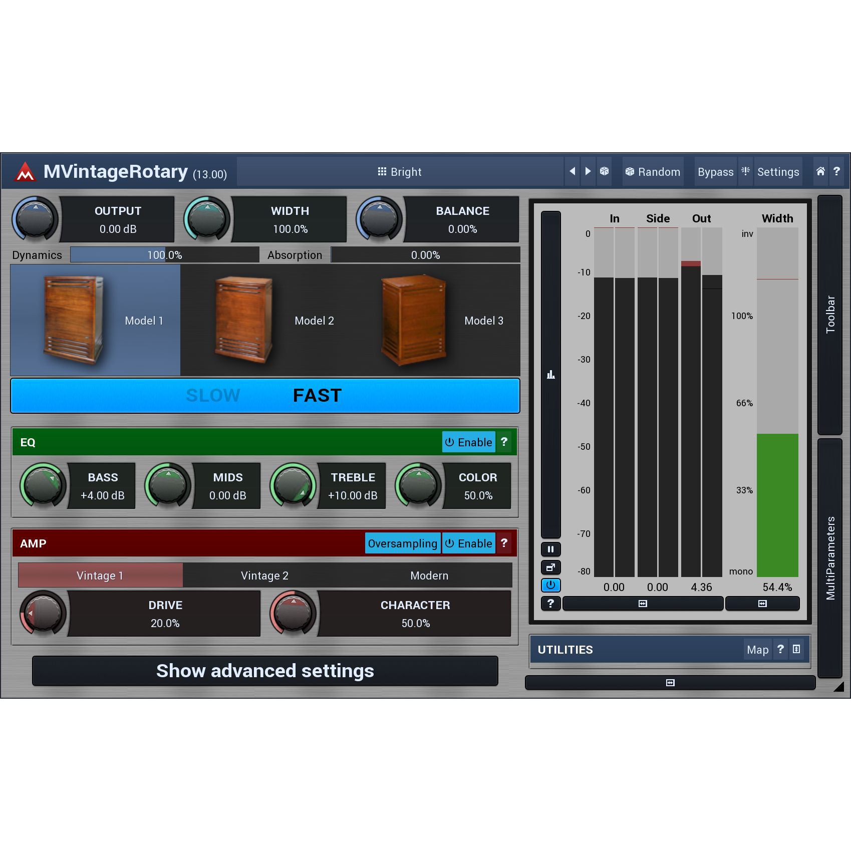 3 great algorithms with advanced features. MVintageRotary not only sounds like (or maybe better than?) the original, it lets you control the stereo width, amount of the dynamics, internal dampening and much more. All of it sounds as natural as possible. And if you are ready, you can get even deeper - synchronize the rotation speeds to the tempo of your song, change rotation direction and more. You can control the slow/fast switch using your MIDI sustain pedal and modulation wheel of course, but again, you can do much more than that...