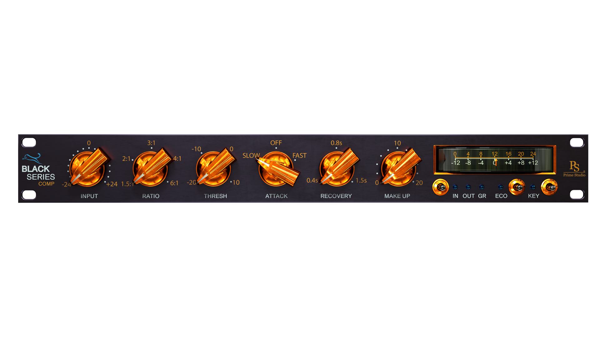 Prime Studio Black Series Compressor Plug-In. Light on CPU usage Prime Studio Black Series Compressor serves you with highest sound quality. Want to get even lighter on CPU usage use the ECO mode which deactivates the harmonic preamp distortion sound of the input stage. A classical solid state compressor modelled after a famous vintage studio device out of the sixties offering ratio, threshold, attack, recovery and make up functionality. On board is a switchable meter for input level, output level and gain reduction control. Use the key switch to use sidechain functionality to fine tune the compression effect (AAX version only).