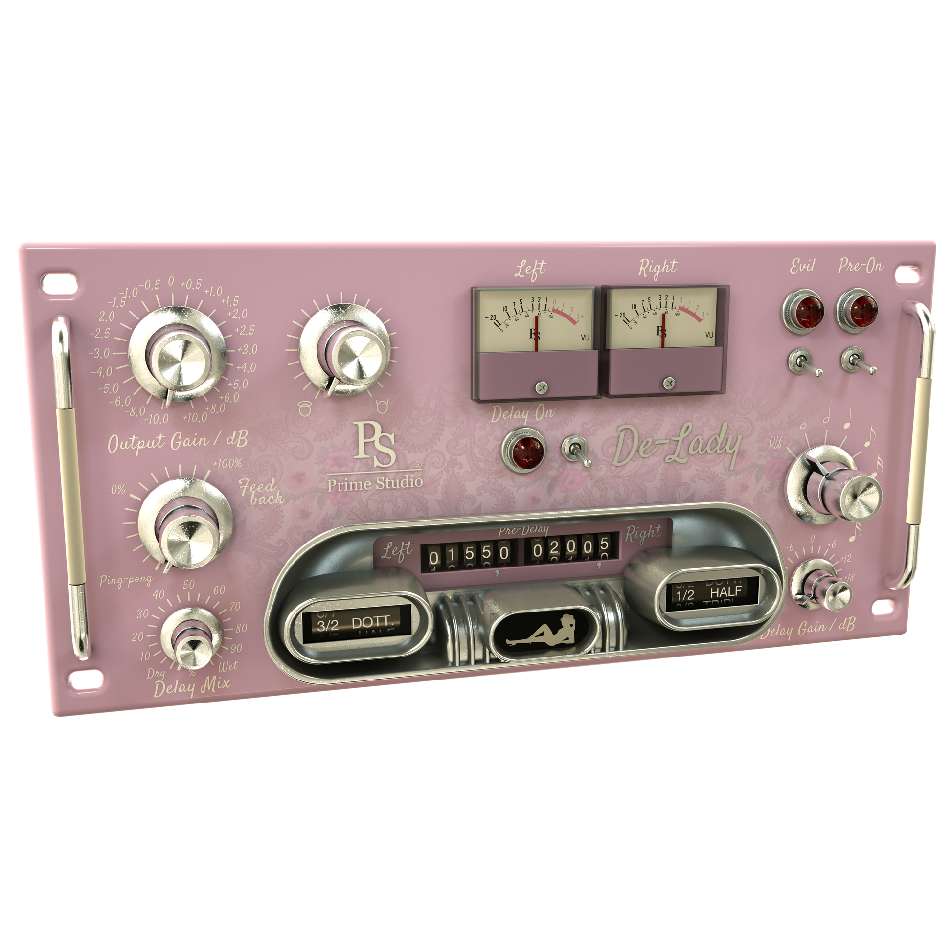 Prime Studio De-Lady Plug-In. De-Lady combines the sound of our famous Charly Triple Six Limited summing tool, based on an analogue tube summing device being heavily modified according to our specifications and a straight forward stereo delay effect offering typical functionality. Shape your mixes adding delay with fine tube punch and soothing harmonic distortion switching on the „Evil“ stage, dialing in from heavenly soft to roasting heavy sounds. Add even more character by setting the output gain to taste always keeping control of your levels using the stereo VU meters.