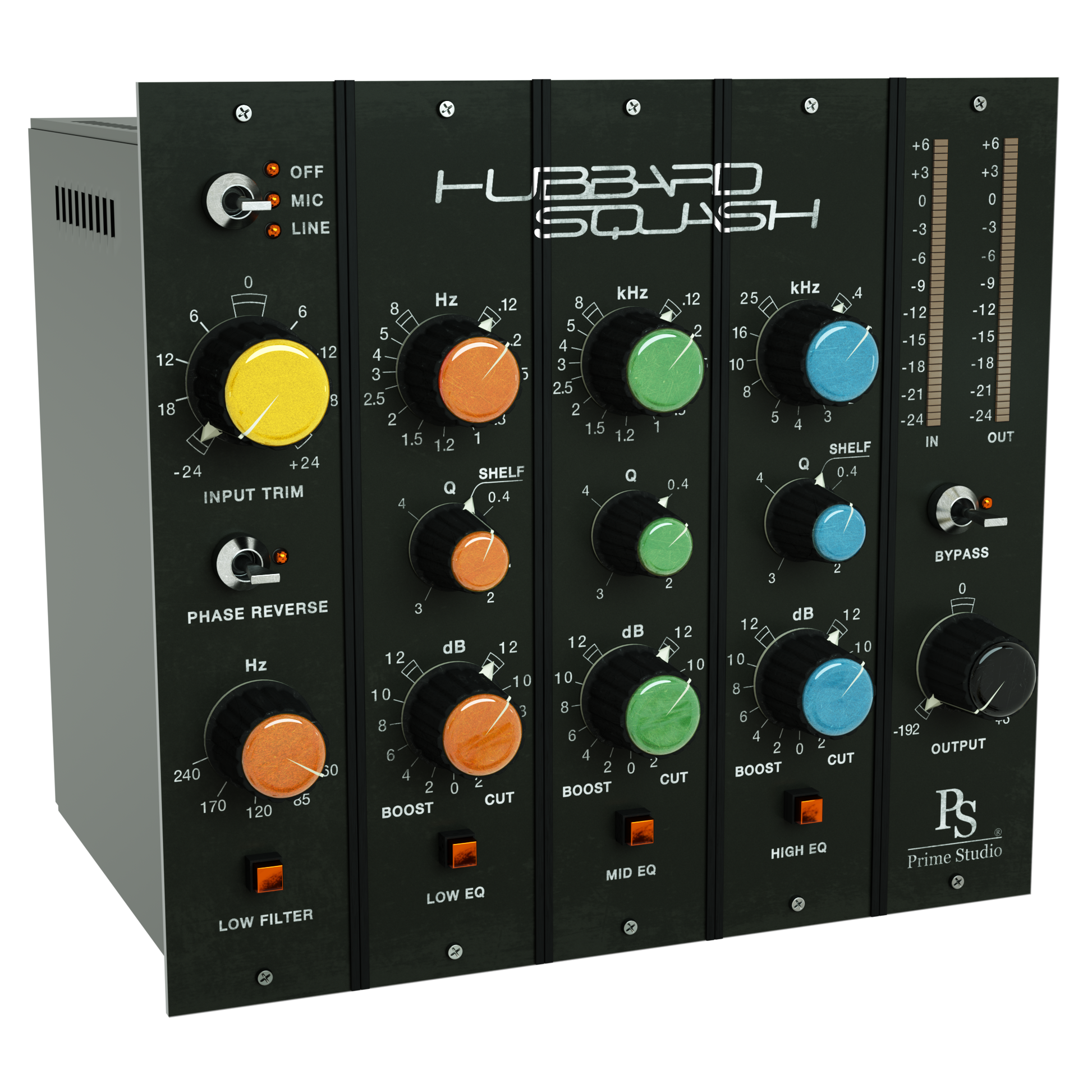 Prime Studio Hubbard Squash Plug-In. Smooth, smoother, Hubbard Squash. Classic three band fully parametric stereo equalizer offering lush tone for separately engage-able low, mid and high frequency bands and a low cut filter. Switch phase to taste and dial in harmonic distortion of two different preamp stages offering line or microphone preamplification tonality. For saving CPU usage you simply can also choose to switch off the preamp characteristics. Keep control of your levels using input and output metering in 80’s led style.
