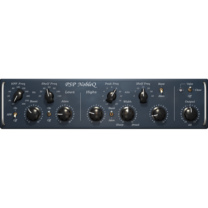 PSP NobleQ combines the features of passive program equalizers with a wide range of frequency settings and extended functionality. To make this plug-in a versatile tool we added several modern features such as an adjustable high pass filter, and the ability to switch high peak and shelf filters to Boost or Attenuation operation.