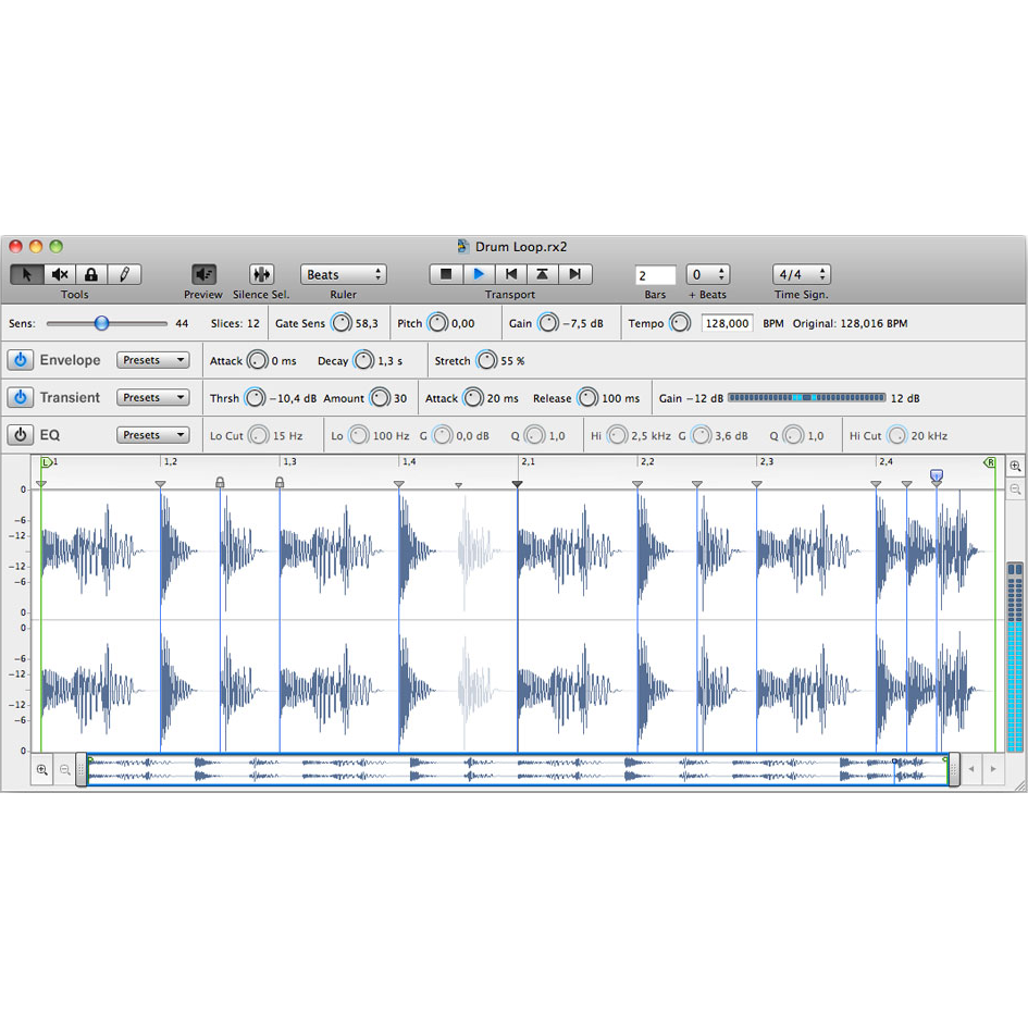 - Tweak - Sculpt your sound with ReCycle’s built-in effects: Transient Shaper, EQ, Envelope and a stretch feature that stretches the tail end of your each slice in the loop.