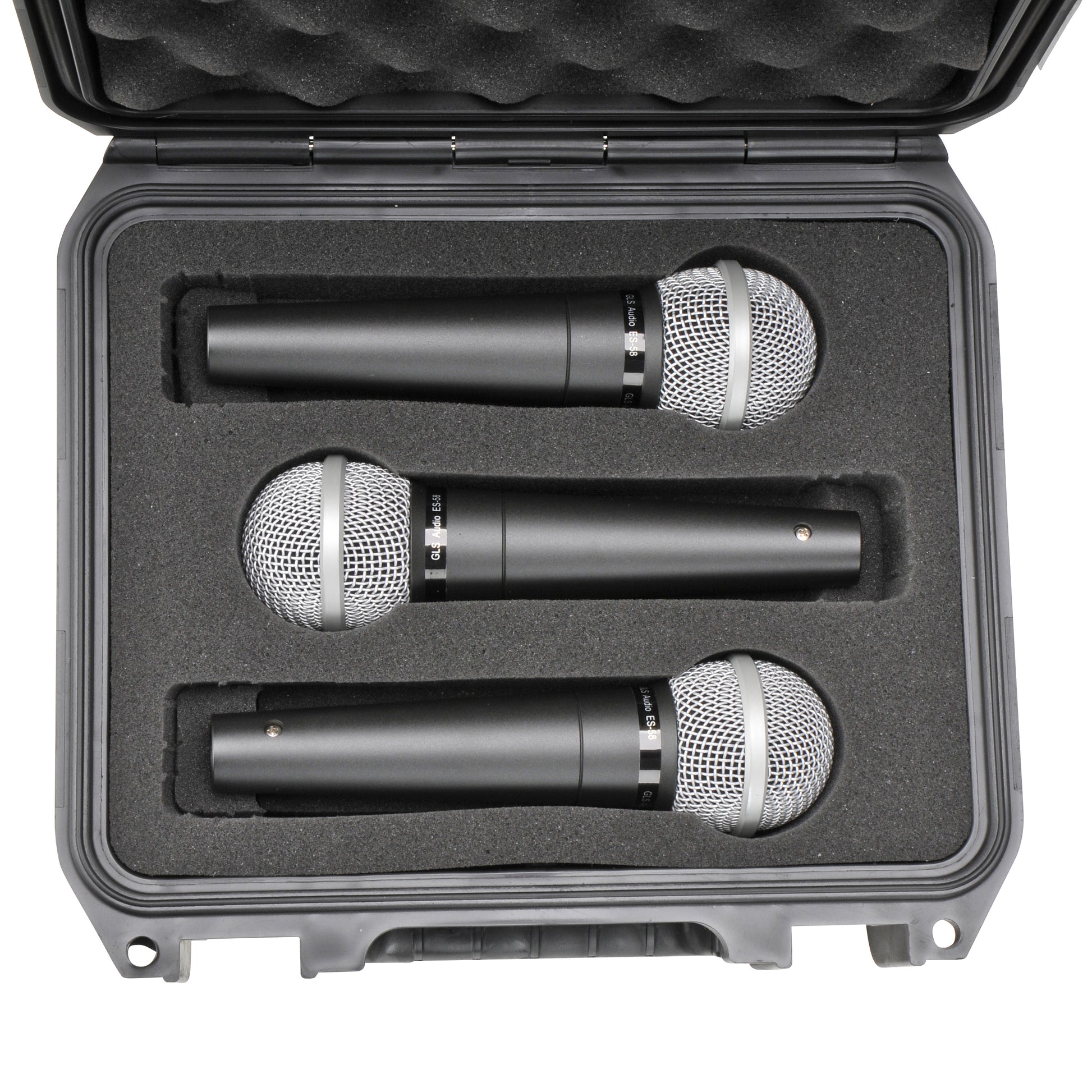 The 3i-0907-MC3 allows 3 mics to be stored horizontally. Each microphone cutout measures 1.5” wide by 6.75” long with two perforated removable foam pieces, one located on each end allowing microphone sizes up to 8.5” in length. By removing the perforated foam piece near the grill of the microphone you can change the shape from being round to square. This will accommodate other popular hand held microphones with square style grills such as the Sennheiser and Electro Voice mics. The 3I-0907-MC3 case measures 9” x 7” x 4” deep and is the most compact 3-mic case on the market. The case has convoluted foam in the lid for a compression fit and is covered by SKB's Unconditional Lifetime Warranty.