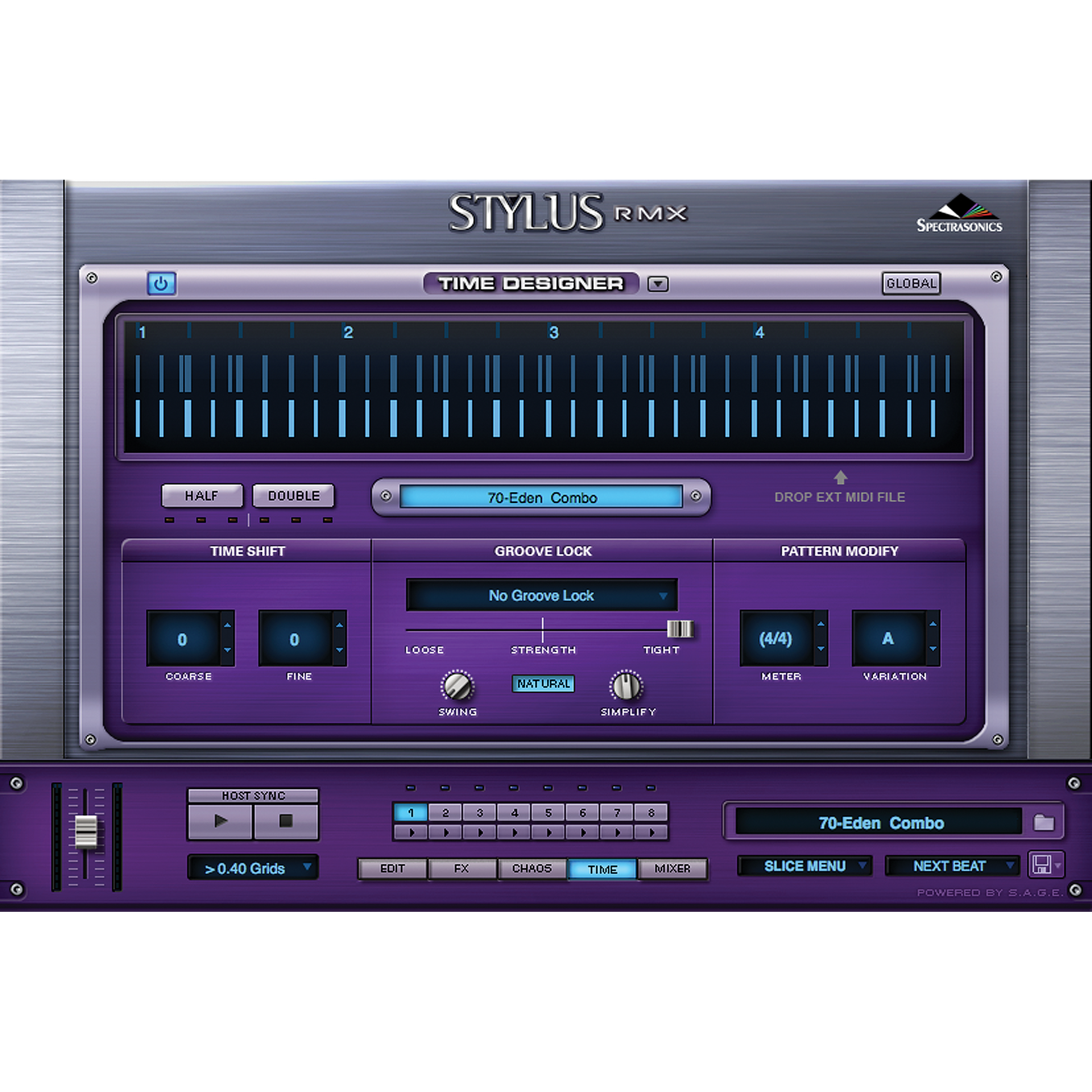 STYLUS RMX XPANDED. Stylus RMX Xpanded is an award-winning, industry standard groove-based virtual instrument plug-in. Stylus RMX Xpanded is the first product to offer the combined power of Groove Control® with Spectrasonics Advanced Groove Engine (S.A.G.E.™) technology giving users dramatic control over groove production and performance. Spectrasonics’ in-house development team created the instrument from the ground up, with dozens of innovative features including the ground-breaking Time Designer®, Chaos Designer®, a completely redesigned multi-page user interface, a legendary core library of sounds, all with a focus on realtime groove creation and performance. RMX quickly became and remains an industry standard tool of most top composers and music producers.