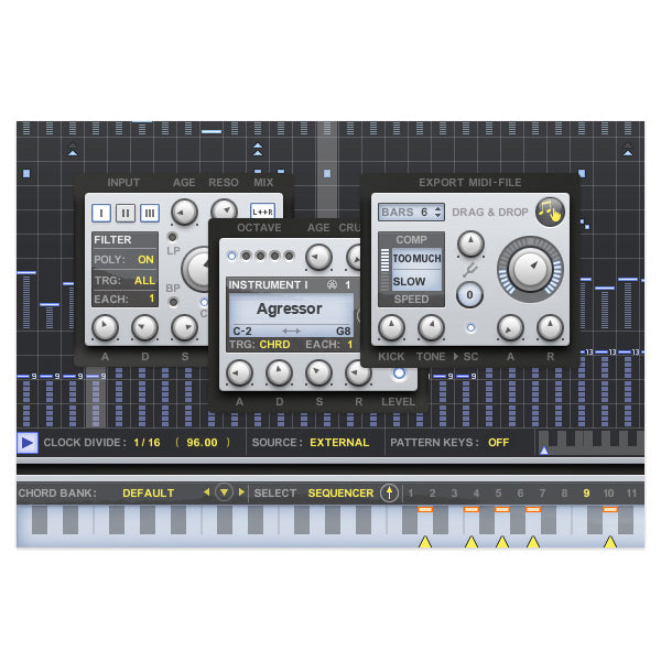 MIDI output on VST & AAX. Control external MIDI devices and plug-ins. Consequence is not limited to the internal sound library: if you wanna combine with other generators, it is possible to use the MIDI out to trigger hardware or software synths, which opens up a lot of possibilities. There’s also the MIDI Export: just drag and drop to your host or save as a file. The final stage of the Consequence sound section is the master section which offers tuning features, a fine master compressor and a kickdrum which plays a 4/4 rhythm. The kickdrum is a friendly helper to keep the groove while you are creating sequences, also it can be sent to the compressor explusively to glue the mix together or let the level drop at each quarter note.