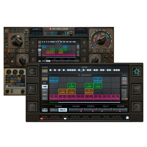 Cyclop FX: Made to impress. Pattern-based sequencer with the FX knob as automatable controller. The effect section is a mixture of Effectrix and Turnado flavors.The four sequencer lanes each hold a different group of effects. The multi effect can be controlled per the FX knob or via a sequencer. Rhythmical effects a lá Effectrix or Turnado at your fingertips – complex sound design becomes child’s play.