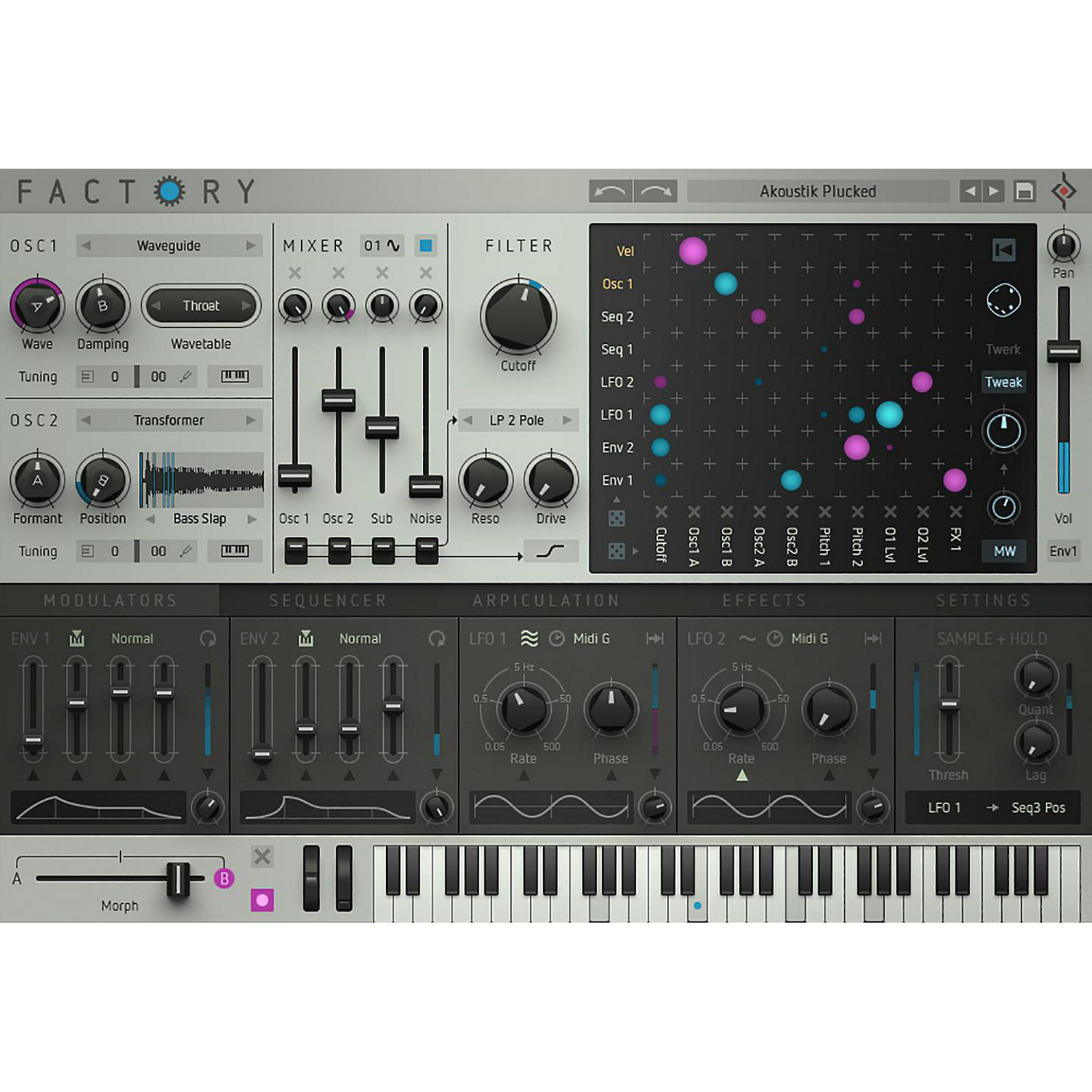 Factory. A versatile Poly Synth with a unique modulation-matrix and -sequencers. Modular Synthesizer for complex and organic sounds. Choose from the most particular synthesis methods, let yourself be charmed by the Matrix and morph between the most improbable variations of your sound. Four sequencers are pulling the strings behind the curtain.