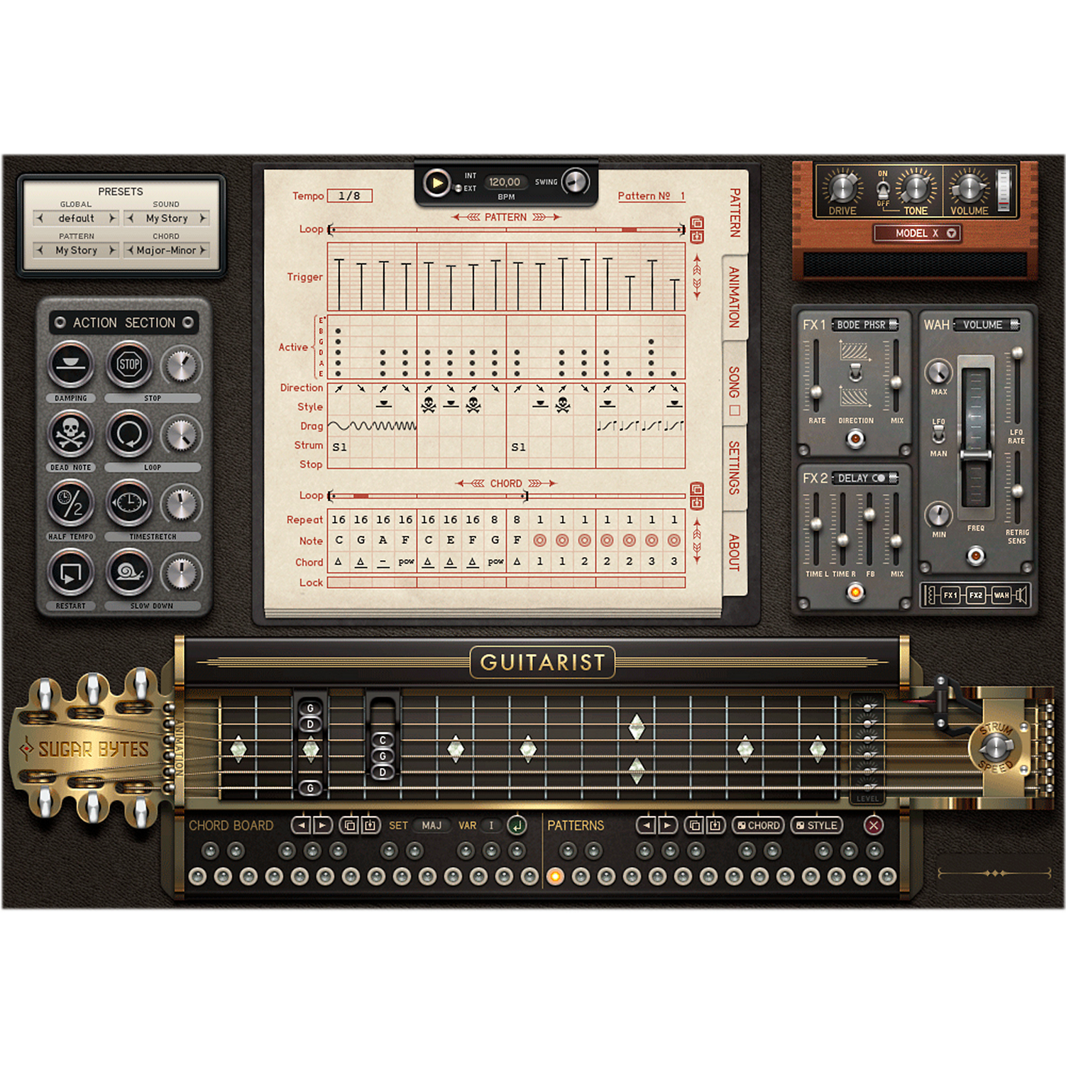 Guitarist. Expressive E-Guitar Emulation. Authentic riffs and sizzling amps. Guitarist is a virtual guitar that's designed to emulate rhythm parts played on an electric guitar. The actual guitar player has been transformed into a step sequencer system with a huge level of customisation when it comes to chords or fingering patterns and a detailed control over authentic nuance and expression.