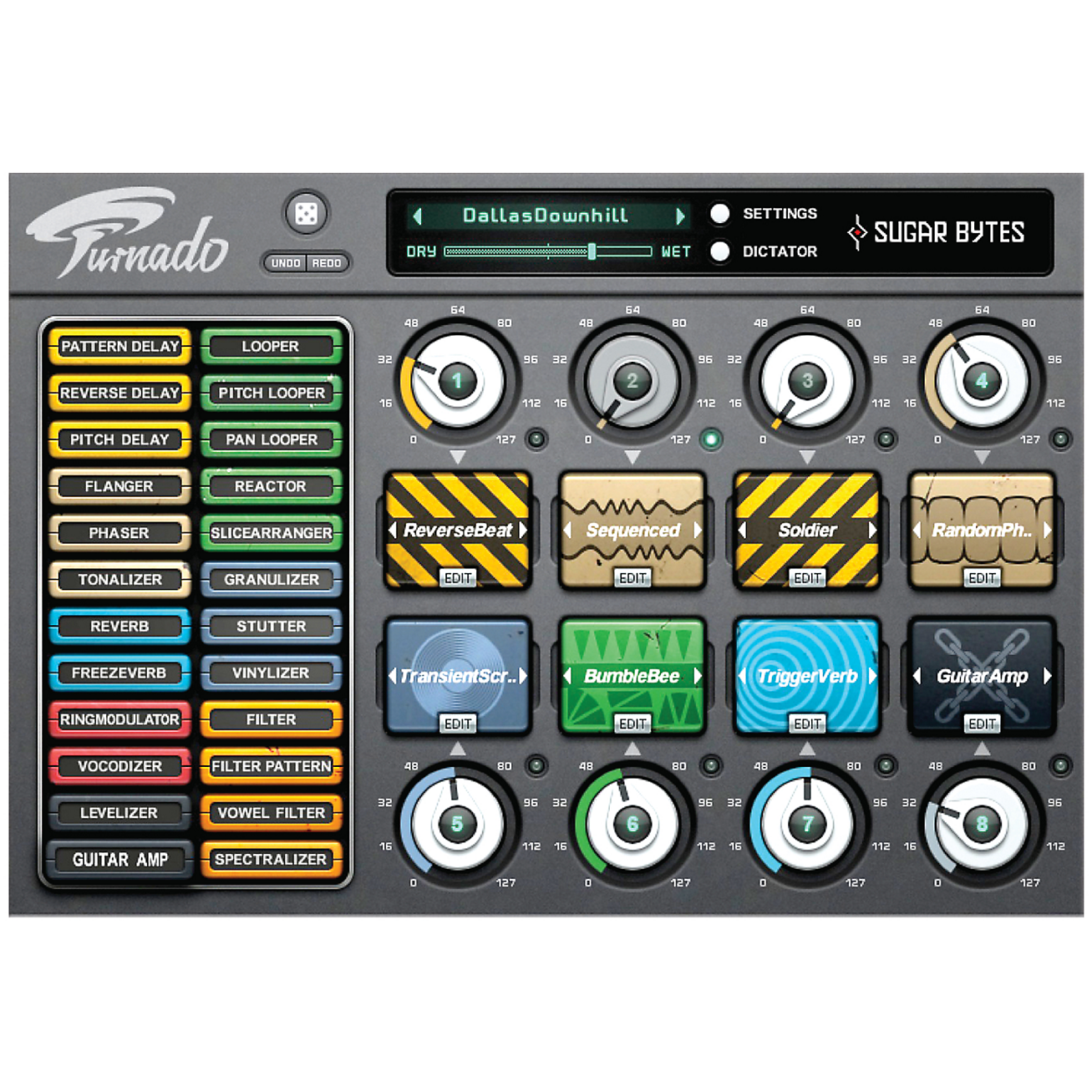 Turnado. Revolutionary Multi Effect for massive real-time audio manipulation. Keep it simple! Turnado comes with 8 knobs, each firing up an effect and varying it with their dial. It invites play and experimentation with one or several effects. Customize 24 effects in expert mode. If you want it even more compact: in Dictator Mode, you can control all 8 effects simultaneously with a single fader.