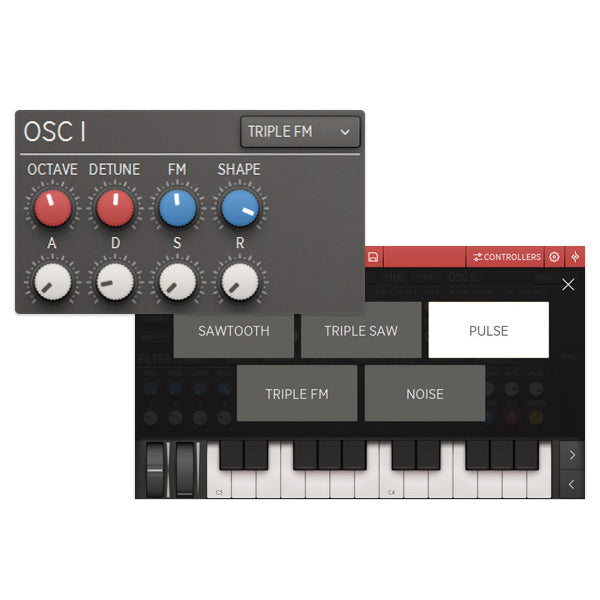 - Sawtooth, Triple Saw, Pulse, Triple FM, Noise with tonal Filter, Sub Sine