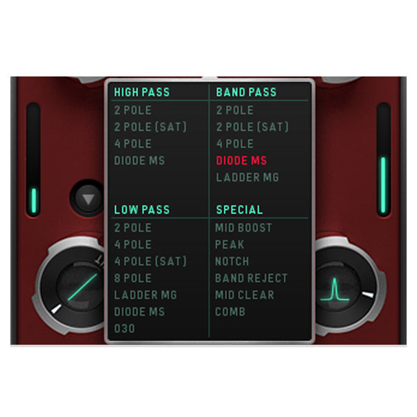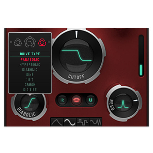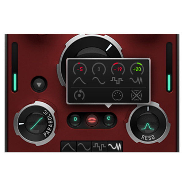 The Distortion Unit. Fourfold Oversampling for harmonic Manipulation without Aliasing. Seven algorithms can be engaged before or after the filter section, which greatly broadens the sonic range. Pick the tube-inspired "Parabolic", the delicately-chiselled "Bit Crusher", a Sine(!) or "Diabolic" from digital hell. Volume is stable even at high levels, which will save you cumbersome automations when things get rather dynamic.