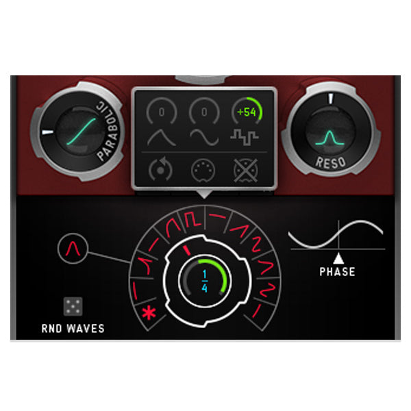 The Wobble Generator. Pushing the Mod Section to extremes. This is a different beast compared to the other modulators. The central knob controls two things: the shape of the LFO (16 different waveforms) while also changing the speed (12 tempo-synced rates). The knob can be modulated itself (pick the LFO for a start) and this is what the wobble control is all about: to get that knob moving!